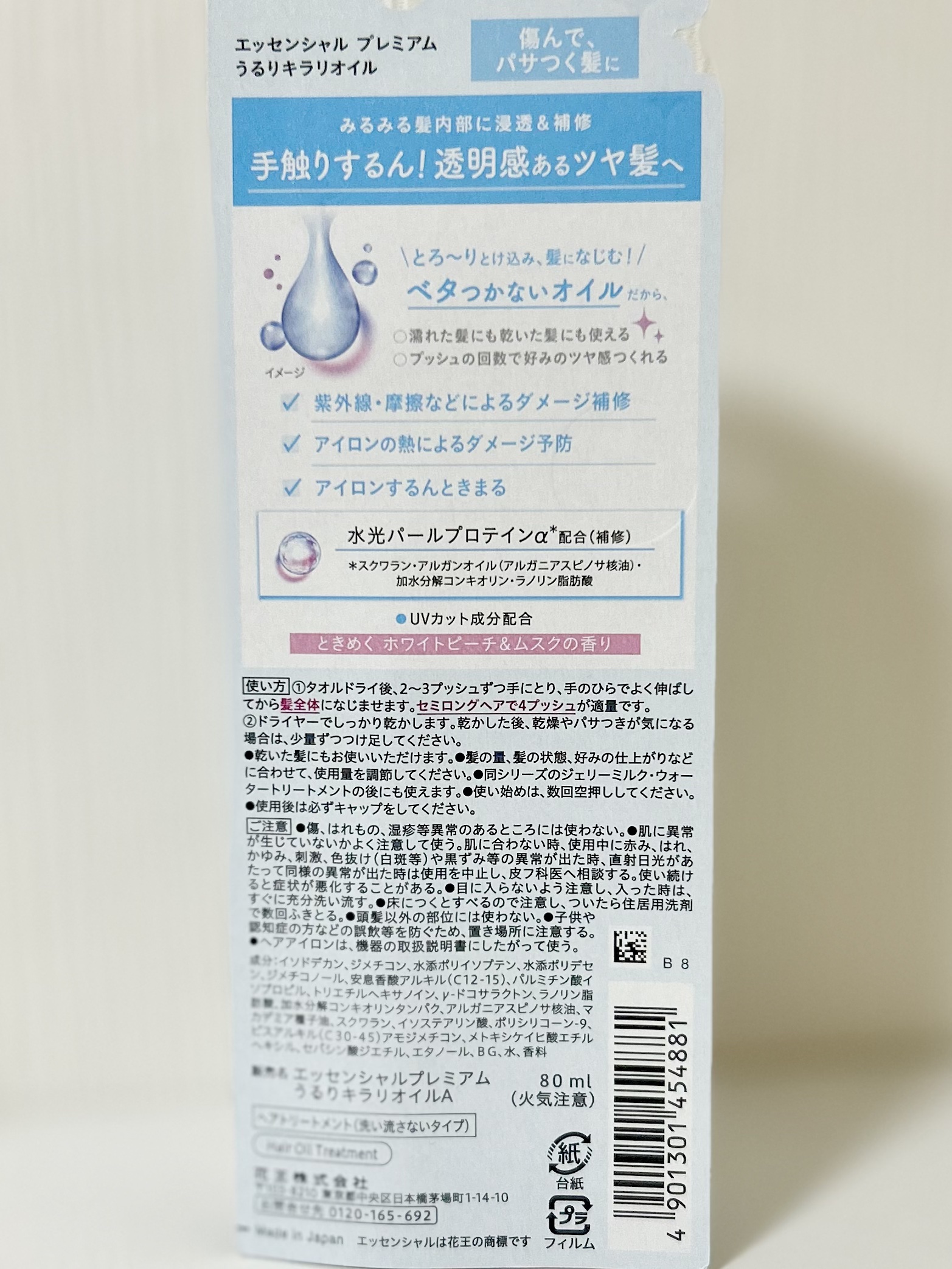 - 傷んで、パサつく髪に。 キラリオイルが髪内部に浸透&補修。 ベタつかず手触りするん!透明感あるツヤ髪へ。 〇紫外線・摩擦などによるダメージ補修 〇アイロンの熱によるダメージ予防 〇アイロンもするんときまる 〇水光パールプロテインα配合(補修)<スクワラン・アルガンオイル(アルガニアスピノサ核油)・加水分解コンキオリン・ラノリン脂肪酸> 〇UVカット成分配合 ○ときめくホワイトピーチ&ムスクの香り