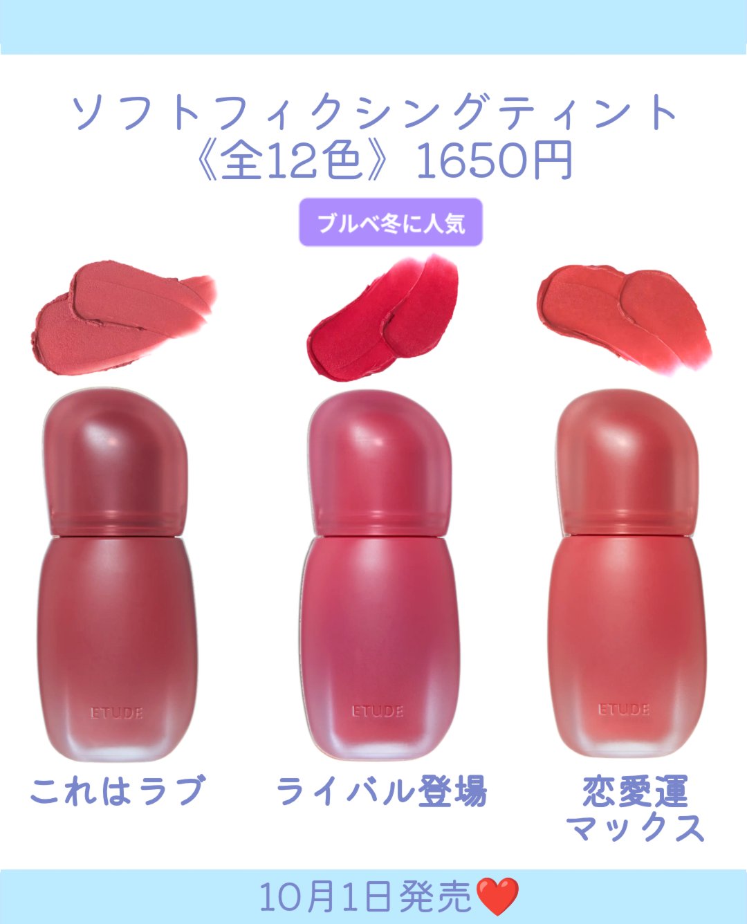ETUDE新作情報⟡.·*.··············································⟡.·*.発売日10/11#生すふれリップ♥ソフトフィクシングティント1.650円♡キュンです♡君へ向かう♡もう一歩近づき...