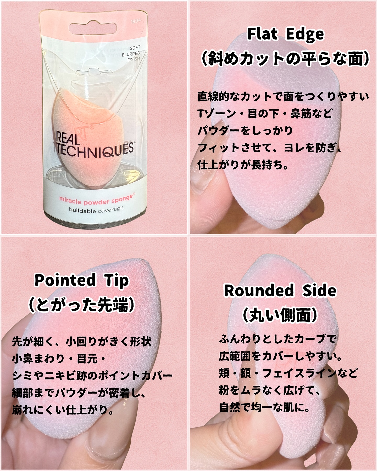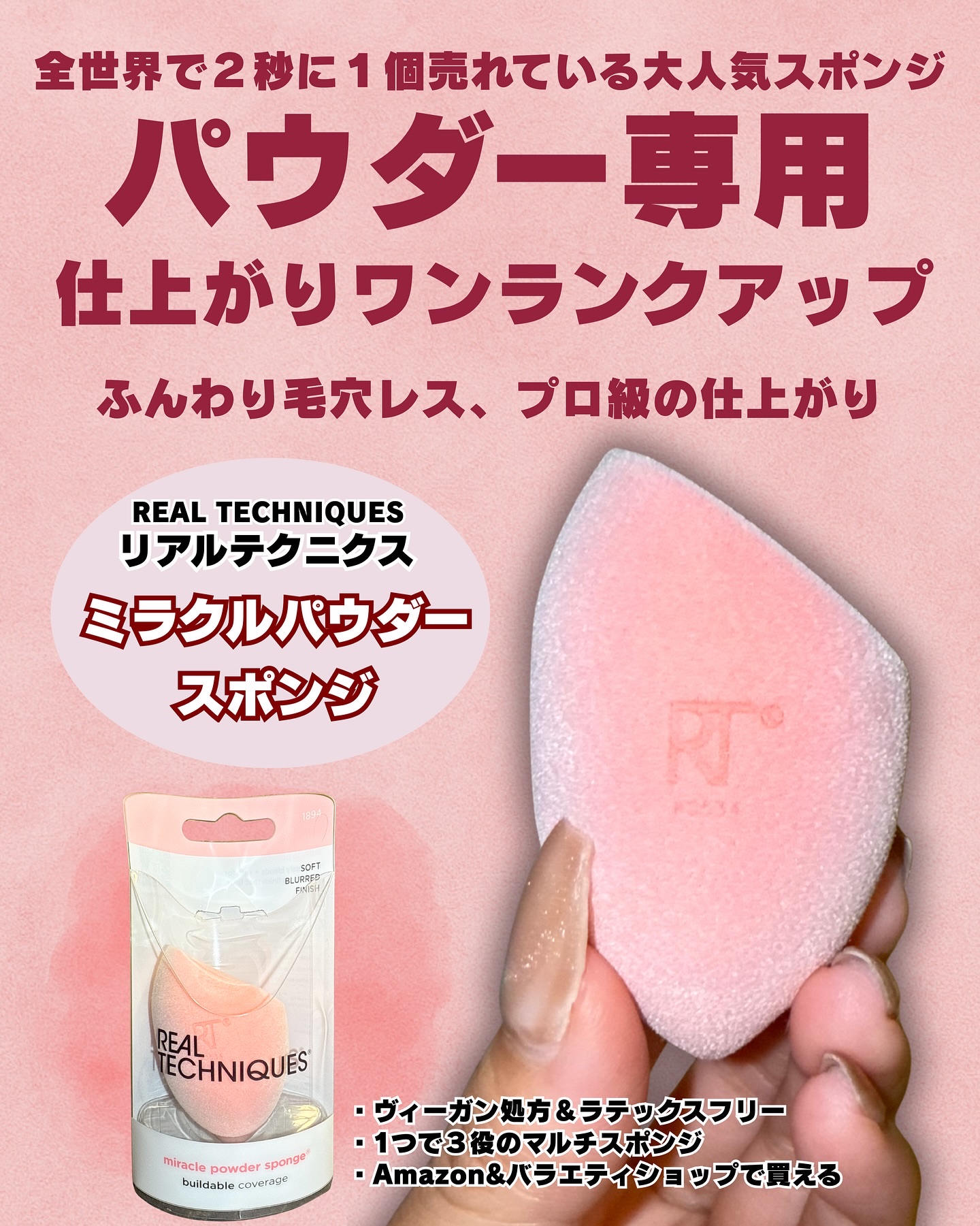 .RealTechniquesミラクルパウダースポンジパウダーファンデーションとセットで使うのにおすすめです◎ヴィーガン処方、ラテックスフリーの多機能スポンジで簡単にプロの仕上がりができるというすぐれもの🎀3つの形状(平らな面・丸い側面...