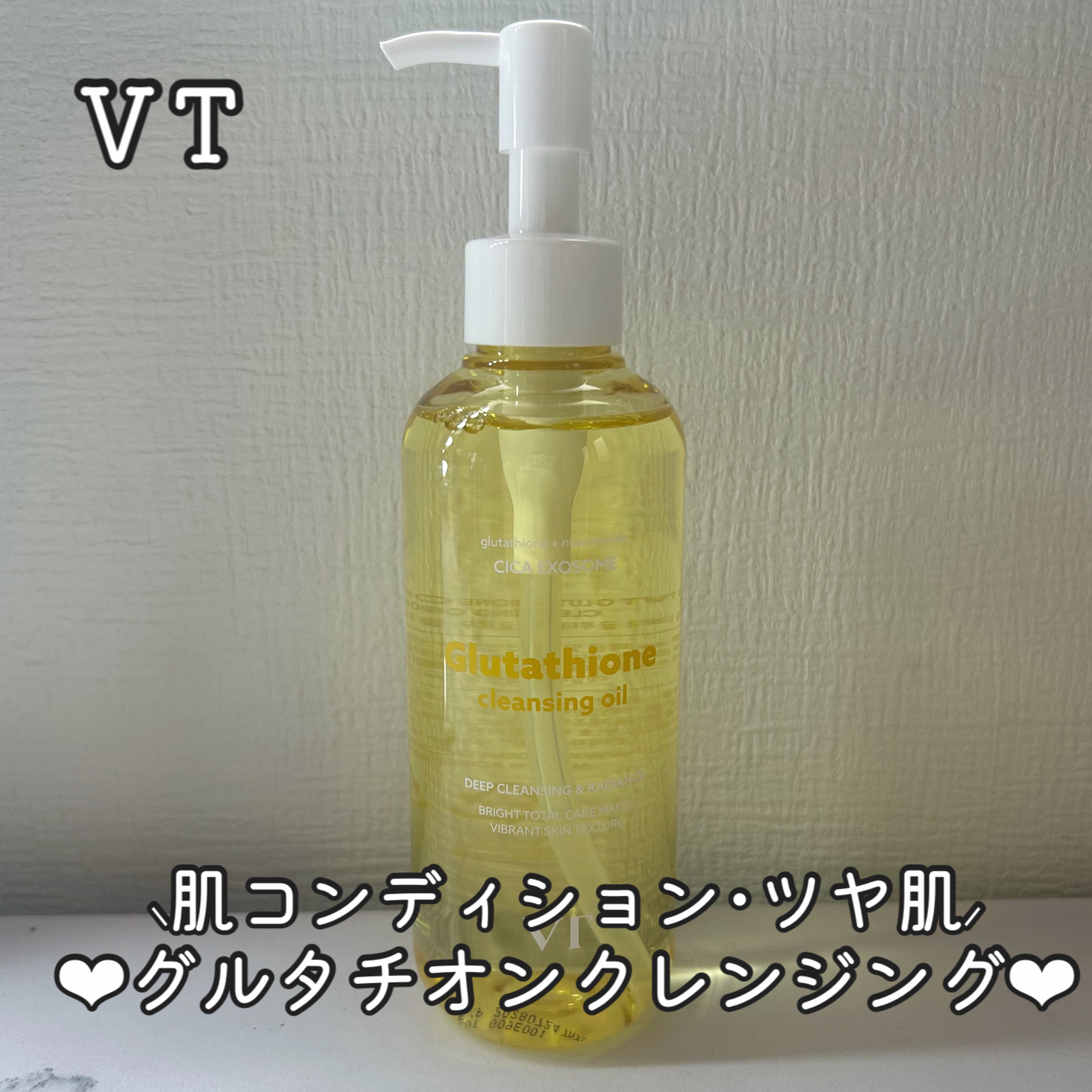 - 美肌サポートといえば、高純度98%グルタチオン*1とナイアシンアミド*1! 肌悩み・気分に合わせて使うデイリーディープクレンジング! 乾燥くすみが気になる肌をオイルで透明感溢れる明るい肌印象にケアするVT GLUTATHIONE! 19種の植物性オイル配合でイチゴ鼻*2もしっかりケア。 VTのクレンジングオイルは水みたいに軽く、乳化も早い! また「癒しの空間を演出するアロマ」の香り付きでリラックス感のあるシャワータイムに。 *1保湿成分 *2古い角質や角栓の蓄積による ■このような方へおすすめ メイク・毛穴までディープクレンジング求める方 クレンジングでスキンケアまで行いたい方 ツッパリ感の少ないクレンジングを探していた方 クレンジングで汚れをスッキリ落として透明感ケアも行いたい方 ■使い方 本品適量を取り、水気のない状態で顔に広げ、マッサージするように優しくなじませます。 その後、手に少量のぬるま湯をつけ、30秒ほど乳化させた後、十分にすすぎます。