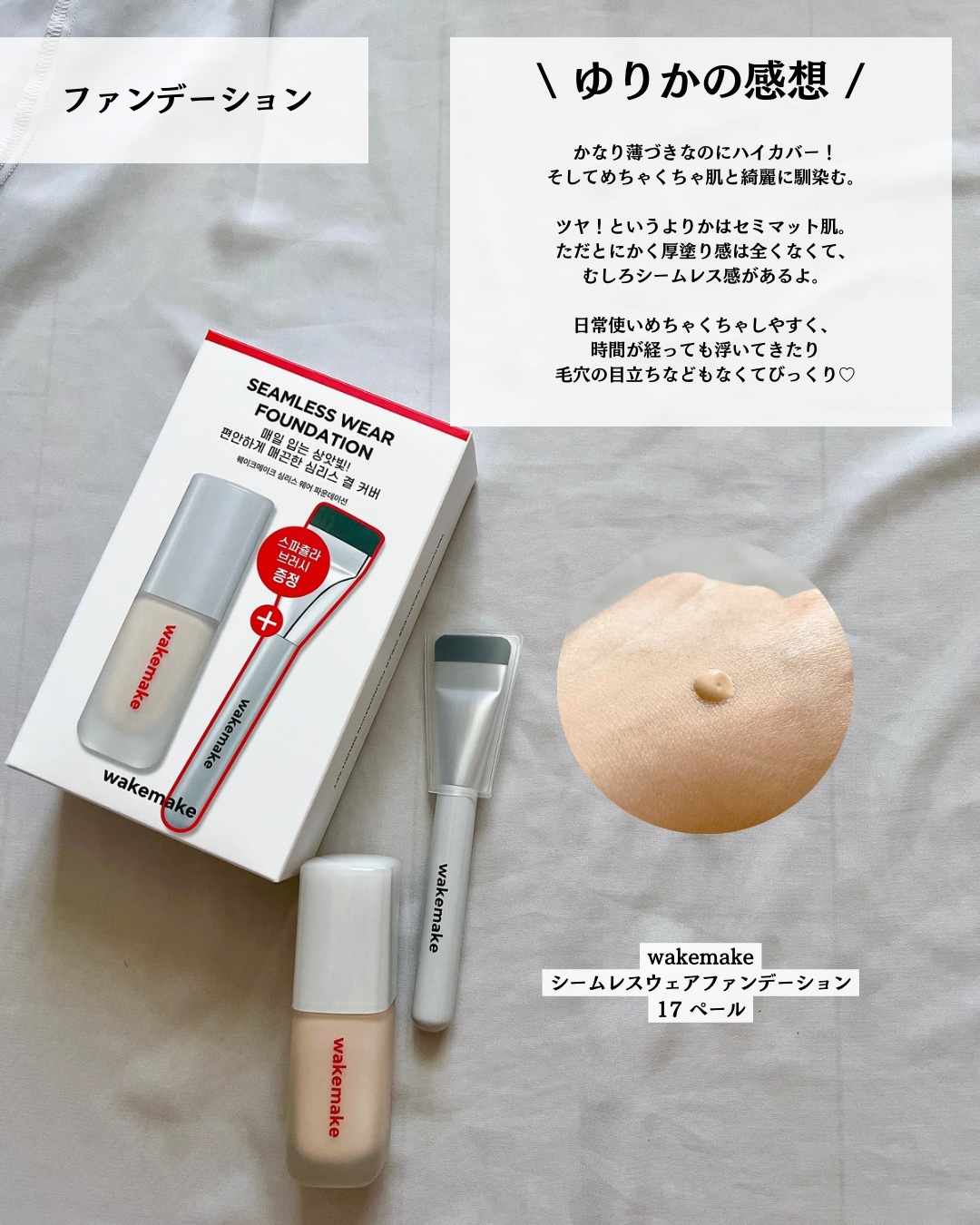 wakemakeシームレスウェアファンデーション 17ペール🦢🫧今話題のリキッドファンデーションを使ってみました(^^)付属の平筆で塗り広げ、パフで均しています塗ってみるとツヤがありつつもしっかりカバーされ、綺麗な仕上がり🤩ただ注意点(⚠️)...