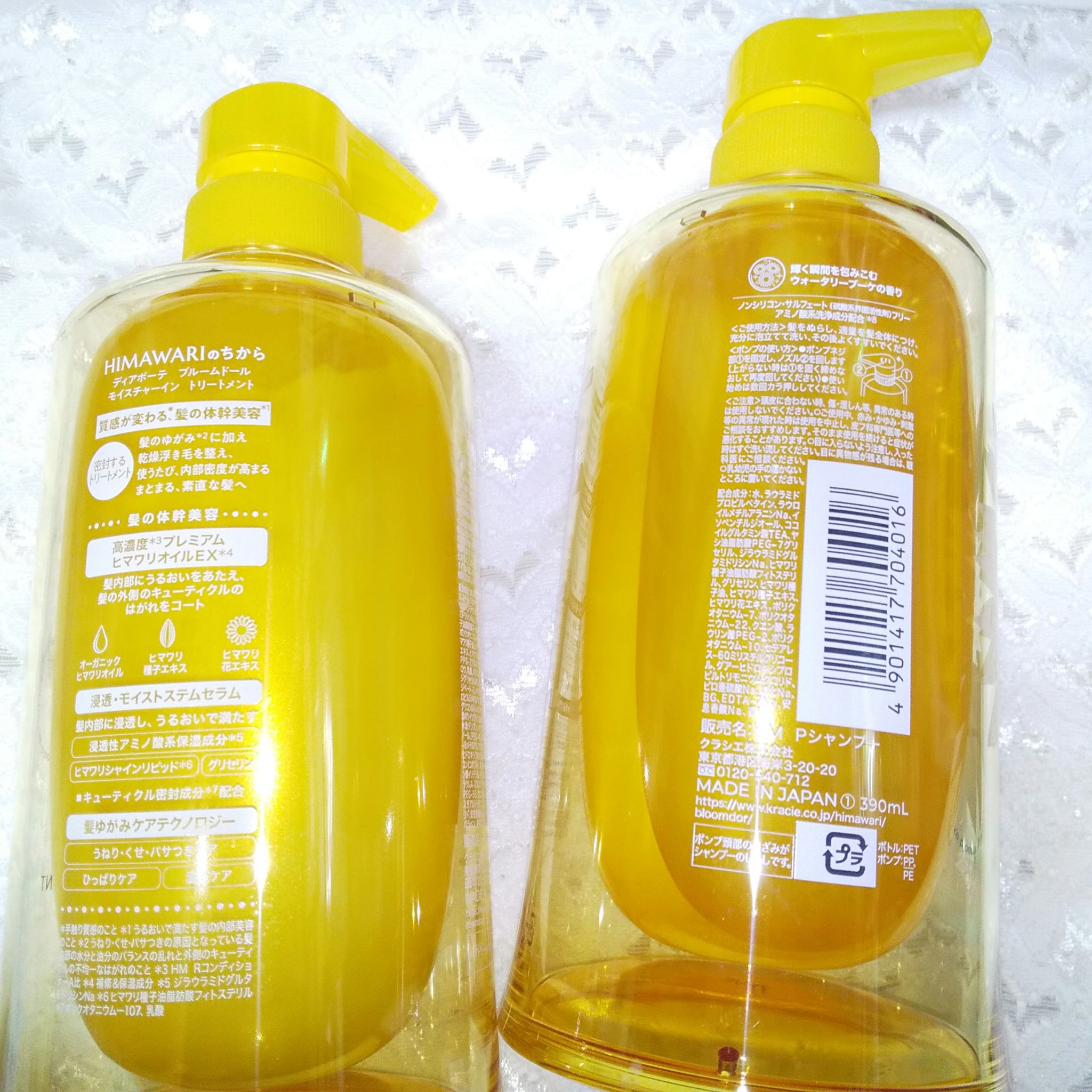 - <シャンプー ポンプ 390ml> 水、ラウラミドプロピルベタイン、ラウロイルメチルアラニンNa、イソペンチルジオール、ココイルグルタミン酸TEA、ヤシ油脂肪酸PEG-7グリセリル、ジラウラミドグルタミドリシンNa、ヒマワリ種子油脂肪酸フィトステリル、グリセリン、ヒマワリ種子油、ヒマワリ種子エキス、ヒマワリ花エキス、ポリクオタニウム-7、ポリクオタニウム-22、クエン酸、ラウリン酸PEG-2、ポリクオタニウム-10、セテアレス-60ミリスチルグリコール、グアーヒドロキシプロピルトリモニウムクロリド、ピロ亜硫酸Na、塩化Na、BG、EDTA-2Na、安息香酸Na、香料 <トリートメント ポンプ 390g> 水、セテアリルアルコール、ジメチコン、グリセリン、ジラウラミドグルタミドリシンNa、ヒマワリ種子油脂肪酸フィトステリル、ポリクオタニウム-107、ヒマワリ種子油、ヒマワリ種子エキス、ヒマワリ花エキス、PPG-2アルギニン、ミツロウ、乳酸、パラフィン、ビスジグリセリルポリアシルアジペート-2、ベヘナミドプロピルジメチルアミン、DPG、グリコシルトレハロース、水添ポリイソブテン、加水分解水添デンプン、イソプロパノール、(PEG-40/PPG-8メチルアミノプロピル/ヒドロキシプロピルジメチコン)コポリマー、ネオペンタン酸イソデシル、ラウレス-4、ラウレス-23、ステアリン酸PEG-55、クエン酸、BG、ステアルトリモニウムクロリド、安息香酸Na、メチルパラベン、香料、カラメル <シャンプー 詰替用 330ml> 水、ラウラミドプロピルベタイン、ラウロイルメチルアラニンNa、イソペンチルジオール、ココイルグルタミン酸TEA、ヤシ油脂肪酸PEG-7グリセリル、ジラウラミドグルタミドリシンNa、ヒマワリ種子油脂肪酸フィトステリル、グリセリン、ヒマワリ種子油、ヒマワリ種子エキス、ヒマワリ花エキス、ポリクオタニウム-7、ポリクオタニウム-22、クエン酸、ラウリン酸PEG-2、ポリクオタニウム-10、セテアレス-60ミリスチルグリコール、グアーヒドロキシプロピルトリモニウムクロリド、ピロ亜硫酸Na、塩化Na、BG、EDTA-2Na、安息香酸Na、香料 <トリートメント 詰替用 330g> 水、セテアリルアルコール、ジメチコン、グリセリン、ジラウラミドグルタミドリシンNa、ヒマワリ種子油脂肪酸フィトステリル、ポリクオタニウム-107、ヒマワリ種子油、ヒマワリ種子エキス、ヒマワリ花エキス、PPG-2アルギニン、ミツロウ、乳酸、パラフィン、ビスジグリセリルポリアシルアジペート-2、ベヘナミドプロピルジメチルアミン、DPG、グリコシルトレハロース、水添ポリイソブテン、加水分解水添デンプン、イソプロパノール、(PEG-40/PPG-8メチルアミノプロピル/ヒドロキシプロピルジメチコン)コポリマー、ネオペンタン酸イソデシル、ラウレス-4、ラウレス-23、ステアリン酸PEG-55、クエン酸、BG、ステアルトリモニウムクロリド、安息香酸Na、メチルパラベン、香料、カラメル