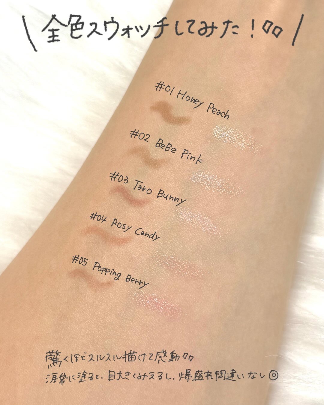 | スルスルなめらかな塗り心地なのに、 目元にピタッと密着!! 指でゴシゴシ擦っても かなーりヨレにくいから、 二重の溝にも溜まりにくいし ラメ飛びしにくい◎ | 詳細を見る | ||