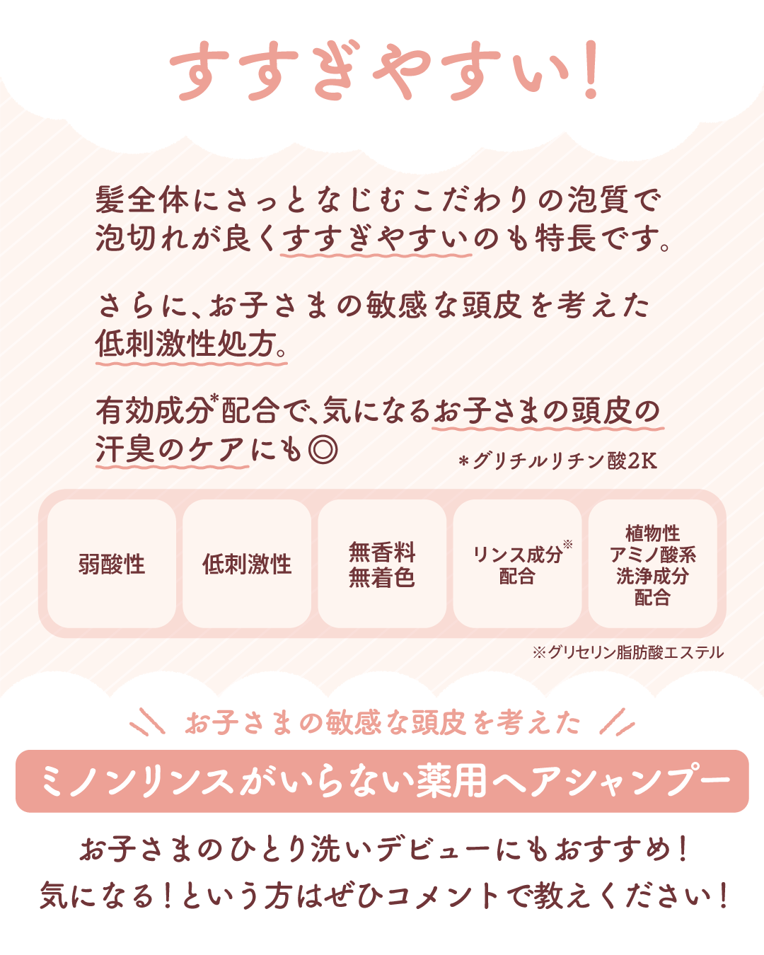 - からまりやすい髪も、1本でさらっとまとまる。頭皮へのやさしさを考えた薬用泡ヘアシャンプー。 頭皮の汗臭、かゆみ・フケなどの頭皮トラブルを防ぐ薬用処方。頭皮のうるおいを守りながら洗い、余分な負担をかけにくい「植物性アミノ酸系洗浄成分」配合。 さらに、リンス成分*配合だから、1本でさらっとまとまる。泡持ちと泡切れの両立にこだわった泡タイプ。 低刺激性、弱酸性、無着色、無香料、アレルギーの原因物質を極力カット。 泡で出てくるから、ベビーシャンプー卒業後のお子さまのひとり洗い用にも。 販売名:DSシャンプーRW【医薬部外品】 *グリセリン脂肪酸エステル
