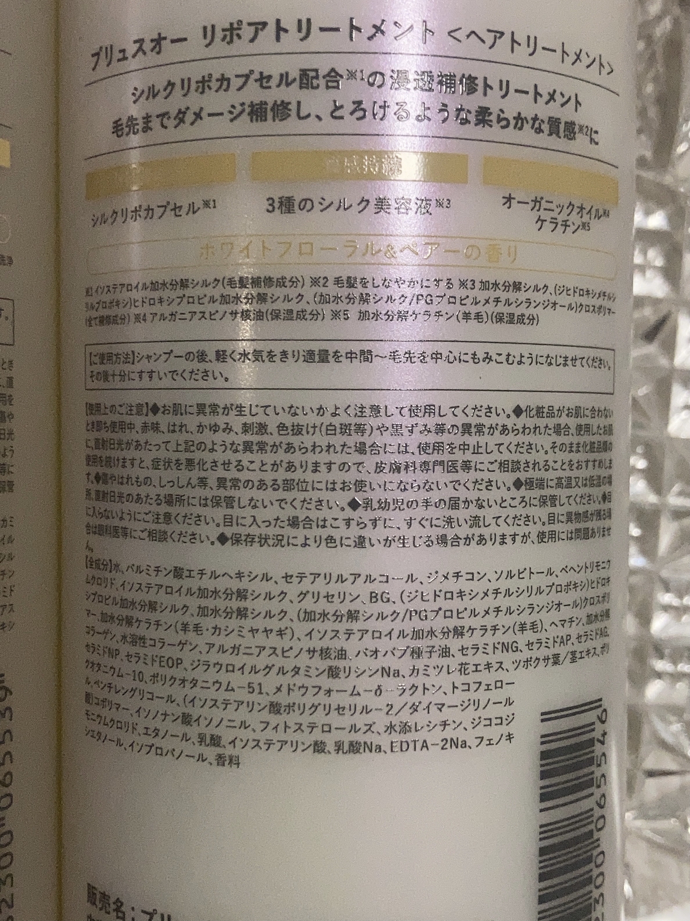 - <シャンプー本体> 水、ラウロイルメチルアラニンNa、コカミドプロピルベタイン、ラウロイル加水分解シルクNa、コカミドDEA、ヤシ油脂肪酸PEG-7グリセリル、ココイルグルタミン酸TEA、ミリスチルベタイン、イソステアロイル加水分解シルク、グリセリン、BG、(ジヒドロキシメチルシリルプロポキシ)ヒドロキシプロピル加水分解シルク、加水分解シルク、ヘマチン、加水分解ケラチン(羊毛・カシミヤヤギ)、イソステアロイル加水分解ケラチン(羊毛)、メドウフォーム-δ-ラクトン、加水分解コラーゲン、水溶性コラーゲン、ポリクオタニウム-10、セラミドNG、セラミドAP、セラミドAG、セラミドNP、セラミドEOP、ジラウロイルグルタミン酸リシンNa、アルガニアスピノサ核油、バオバブ種子油、グリチルリチン酸2K、カミツレ花エキス、ツボクサ葉/茎エキス、エチルヘキシルグリセリン、ペンチレングリコール、イソノナン酸イソノニル、水添レシチン、塩化Na、エタノール、ペンテト酸5Na、フェノキシエタノール、安息香酸Na、フィトステロールズ、トコフェロール、クエン酸、ココイルメチルタウリンNa、トリイソステアリン酸PEG-160ソルビタン、クエン酸Na、イソステアリン酸、香料 <トリートメント本体> 水、パルミチン酸エチルヘキシル、セテアリルアルコール、ジメチコン、ソルビトール、ベヘントリモニウムクロリド、イソステアロイル加水分解シルク、グリセリン、BG、(ジヒドロキシメチルシリルプロポキシ)ヒドロキシプロピル加水分解シルク、加水分解シルク、(加水分解シルク/PGプロピルメチルシランジオール)クロスポリマー、加水分解ケラチン(羊毛・カシミヤヤギ)、イソステアロイル加水分解ケラチン(羊毛)、ヘマチン、加水分解コラーゲン、水溶性コラーゲン、アルガニアスピノサ核油、バオバブ種子油、セラミドNG、セラミドAP、セラミドAG、セラミドNP、セラミドEOP、ジラウロイルグルタミン酸リシンNa、カミツレ花エキス、ツボクサ葉/茎エキス、ポリクオタニウム-10、ポリクオタニウム-51、メドウフォーム-δ-ラクトン、トコフェロール、ペンチレングリコール、(イソステアリン酸ポリグリセリル-2/ダイマージリノール酸)コポリマー、イソノナン酸イソノニル、フィトステロールズ、水添レシチン、ジココジモニウムクロリド、エタノール、乳酸、イソステアリン酸、乳酸Na、EDTA-2Na、フェノキシエタノール、イソプロパノール、香料 <シャンプー 詰替え> 水、ラウロイルメチルアラニンNa、コカミドプロピルベタイン、ラウロイル加水分解シルクNa、コカミドDEA、ヤシ油脂肪酸PEG-7グリセリル、ココイルグルタミン酸TEA、ミリスチルベタイン、イソステアロイル加水分解シルク、グリセリン、BG、(ジヒドロキシメチルシリルプロポキシ)ヒドロキシプロピル加水分解シルク、加水分解シルク、ヘマチン、加水分解ケラチン(羊毛・カシミヤヤギ)、イソステアロイル加水分解ケラチン(羊毛)、メドウフォーム-δ-ラクトン、加水分解コラーゲン、水溶性コラーゲン、ポリクオタニウム-10、セラミドNG、セラミドAP、セラミドAG、セラミドNP、セラミドEOP、ジラウロイルグルタミン酸リシンNa、アルガニアスピノサ核油、バオバブ種子油、グリチルリチン酸2K、カミツレ花エキス、ツボクサ葉/茎エキス、エチルヘキシルグリセリン、ペンチレングリコール、イソノナン酸イソノニル、水添レシチン、塩化Na、エタノール、ペンテト酸5Na、フェノキシエタノール、安息香酸Na、フィトステロールズ、トコフェロール、クエン酸、ココイルメチルタウリンNa、トリイソステアリン酸PEG-160ソルビタン、クエン酸Na、イソステアリン酸、香料 <トリートメント 詰替え> 水、パルミチン酸エチルヘキシル、セテアリルアルコール、ジメチコン、ソルビトール、ベヘントリモニウムクロリド、イソステアロイル加水分解シルク、グリセリン、BG、(ジヒドロキシメチルシリルプロポキシ)ヒドロキシプロピル加水分解シルク、加水分解シルク、(加水分解シルク/PGプロピルメチルシランジオール)クロスポリマー、加水分解ケラチン(羊毛・カシミヤヤギ)、イソステアロイル加水分解ケラチン(羊毛)、ヘマチン、加水分解コラーゲン、水溶性コラーゲン、アルガニアスピノサ核油、バオバブ種子油、セラミドNG、セラミドAP、セラミドAG、セラミドNP、セラミドEOP、ジラウロイルグルタミン酸リシンNa、カミツレ花エキス、ツボクサ葉/茎エキス、ポリクオタニウム-10、ポリクオタニウム-51、メドウフォーム-δ-ラクトン、トコフェロール、ペンチレングリコール、(イソステアリン酸ポリグリセリル-2/ダイマージリノール酸)コポリマー、イソノナン酸イソノニル、フィトステロールズ、水添レシチン、ジココジモニウムクロリド、エタノール、乳酸、イソステアリン酸、乳酸Na、EDTA-2Na、フェノキシエタノール、イソプロパノール、香料