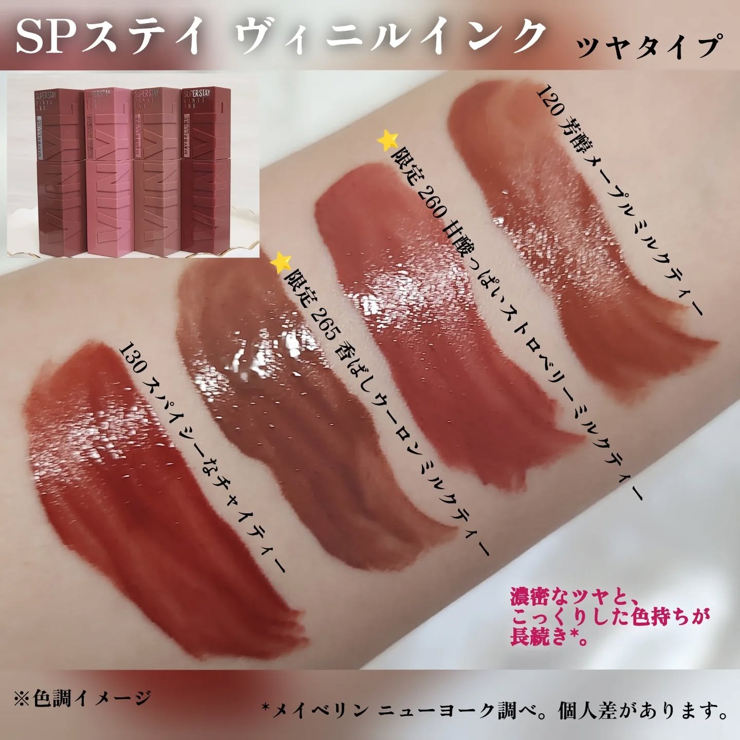 ☆☆☆落ちにくくて発色もきれいなメイベリンニューヨークの「SPステイヴィニルインク」と「SPステイマットインク」シリーズから「パールミルクティーコレクション」発売✨∞∞💋メイベリンニューヨークSPステイヴィニルインク260(甘酸っぱいストロベ...