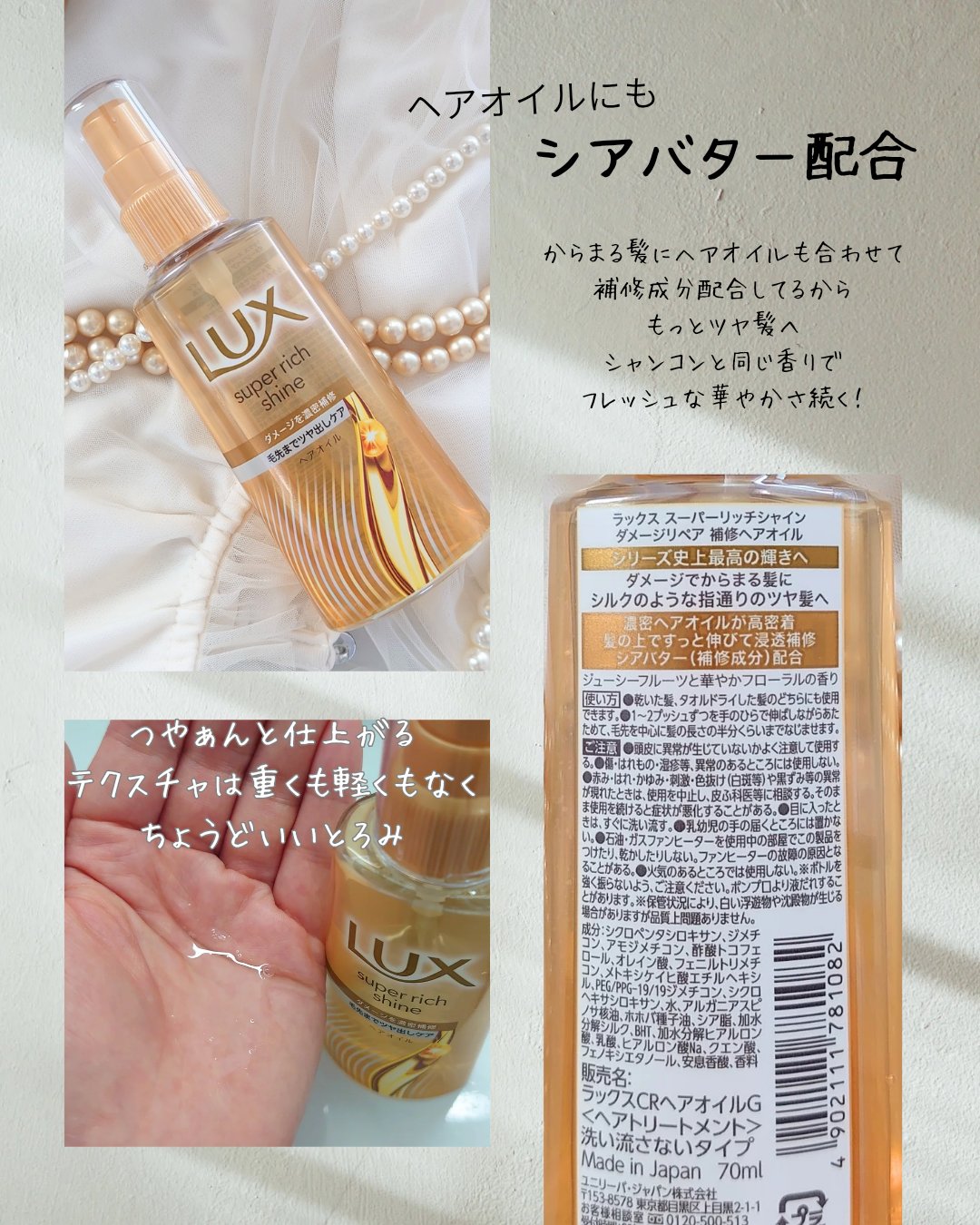 LIPSを通し、LUXより「スーパーリッチシャインダメージリペア補修シャンプー/補修コンディショナー」と「スーパーリッチシャインダメージリペア補修ヘアオイル」を頂きました。LUXスーパーリッチシャインが10年ぶりに大幅リニューアルとなりました...