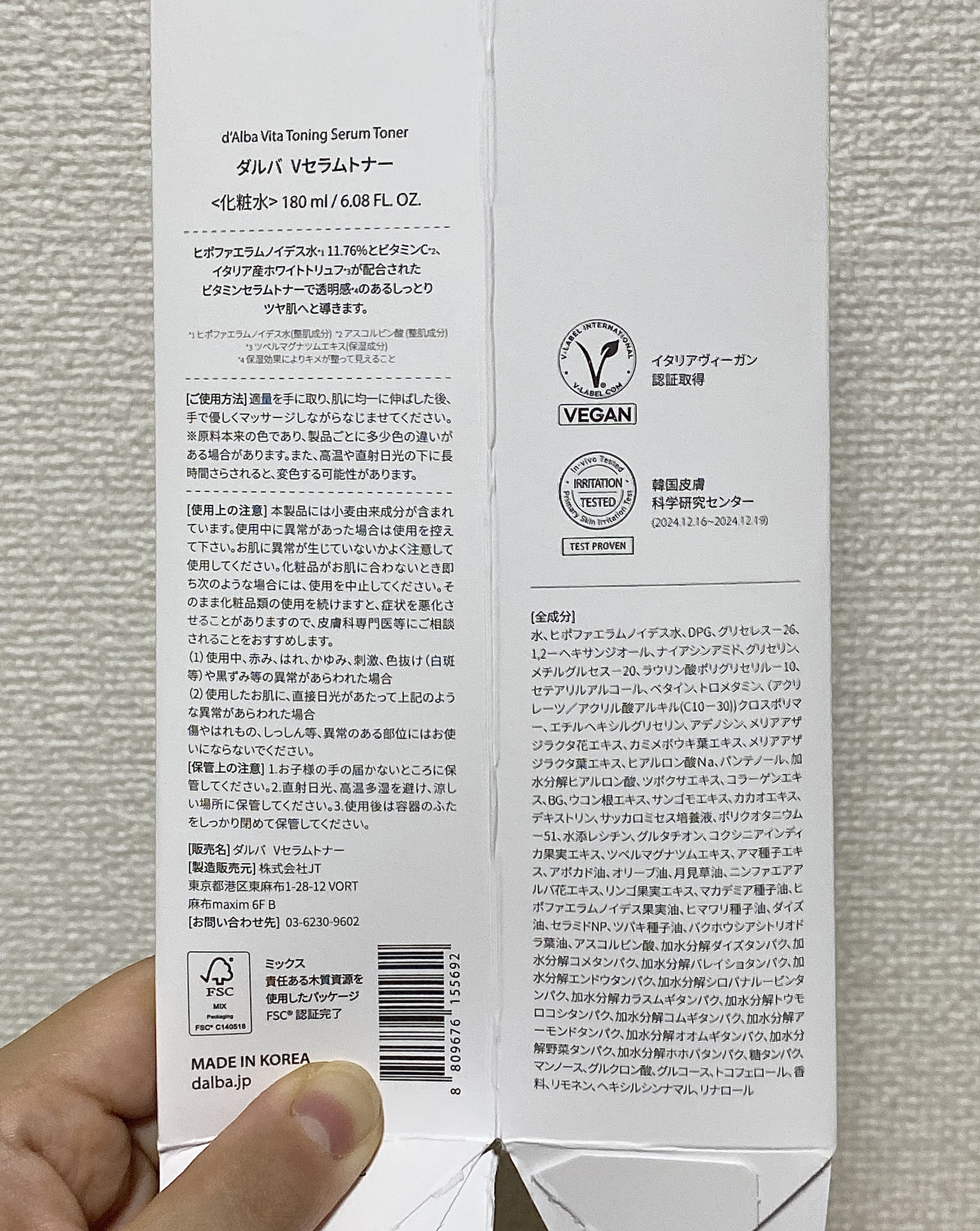 - 吸収の早いセラムウォーターテクスチャーでしっとり爽やかヴィーガンセラムトナー みずみずしさ弾ける水分感で保湿はしっかり、 仕上がりはさっぱり。 ヴィーガン認証完了で安心して使用して頂けます。 イタリアヴィーガン認証V-LABEL取得しました。 皮膚低刺激テスト済み* *全ての方に皮膚刺激が発生しないということではありません。 【ご使用方法】 1. デイリーケアとしての使用法 適量を手に取り肌にまんべんなく塗ります。 2.ふき取りケアとしての使用法 コットンに適量を含ませ肌のキメに合わせ撫でるように優しく吸収させます。 【使用上の注意】 本製品には小麦由来成分が含まれています、使用中に異常があった場合は使用を控え下さい。 お肌に異常が生じていないかよく注意して使用してください。 化粧品がお肌に合わないとき即ち次のような場合には、使用を中止してください。 そのまま化粧品類の使用を続けますと、症状を悪化させることがありますので、皮膚科専門医等にご相談されることをおすすめします。 (1)使用中、赤味、はれ、かゆみ、刺激、色抜け(白斑等)や黒ずみ等の異常があらわれた場合 (2)使用したお肌に、直接日光があたって上記のような異常があらわれた場合 傷やはれもの、しっしん等、異常のある部位にはお使いにならないでください。