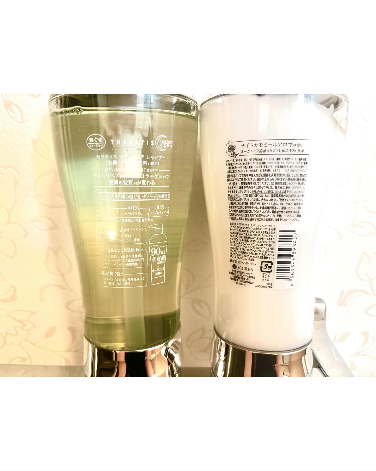 THERATISbymiximナイトリペアシャンプー/ヘアトリートメント寝ている間に補修成分がしみ込み、うねり、寝ぐせを抑制する新ナイトリペアヘアケア。シャンプーとろんとしたテクスチャー。泡立ちが良いです。ホホバオイル由来の洗浄成分でうるおい...