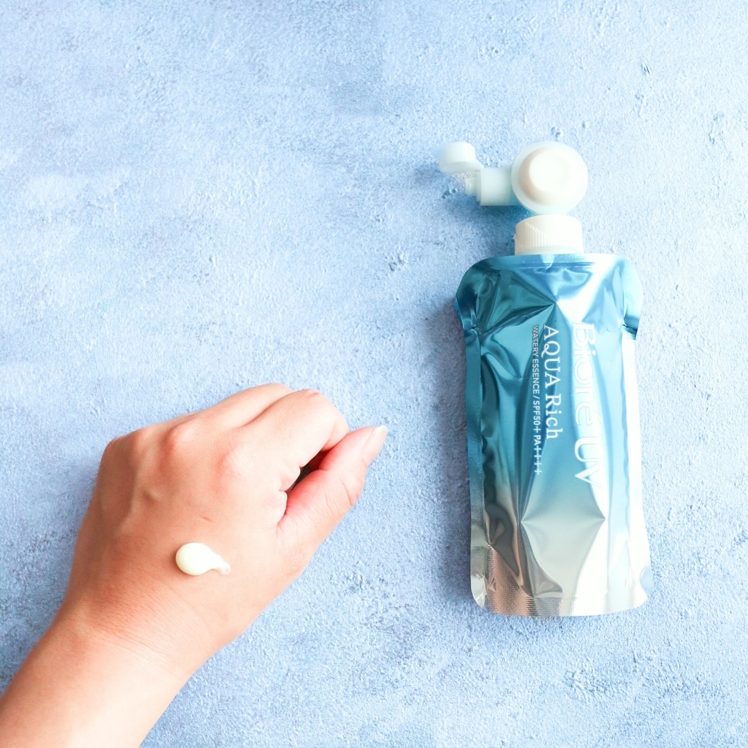 Biore'アクアリッチフレッシュパウチ大容量120g!SPF50+PA++++水耐性★★Point1最後まで外気に触れず、清潔に使える!Point2独自開発の瞬時になじむ製剤軽くてみずみずしい使い心地。瞬時になじみムラなく塗れる!肌になじむ...
