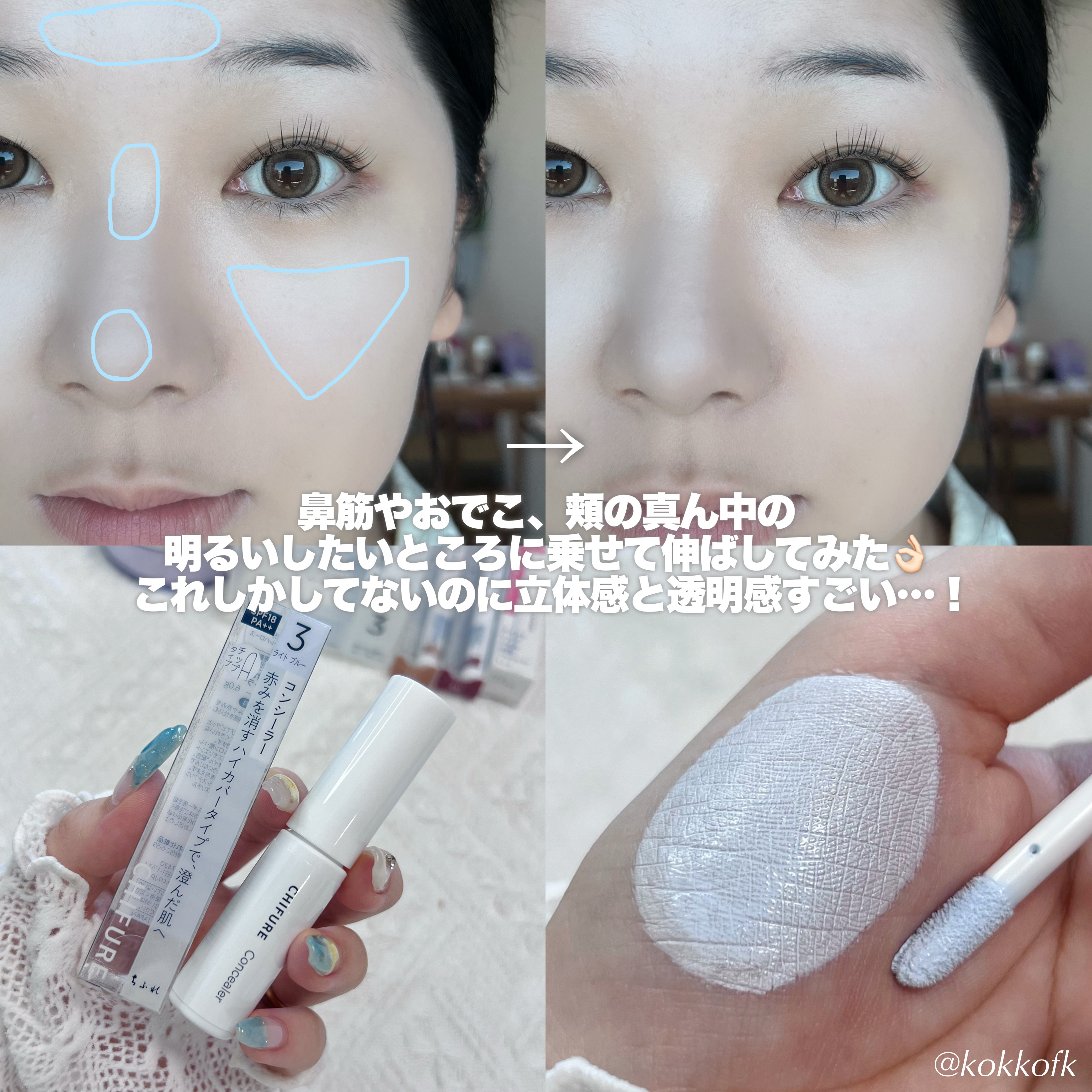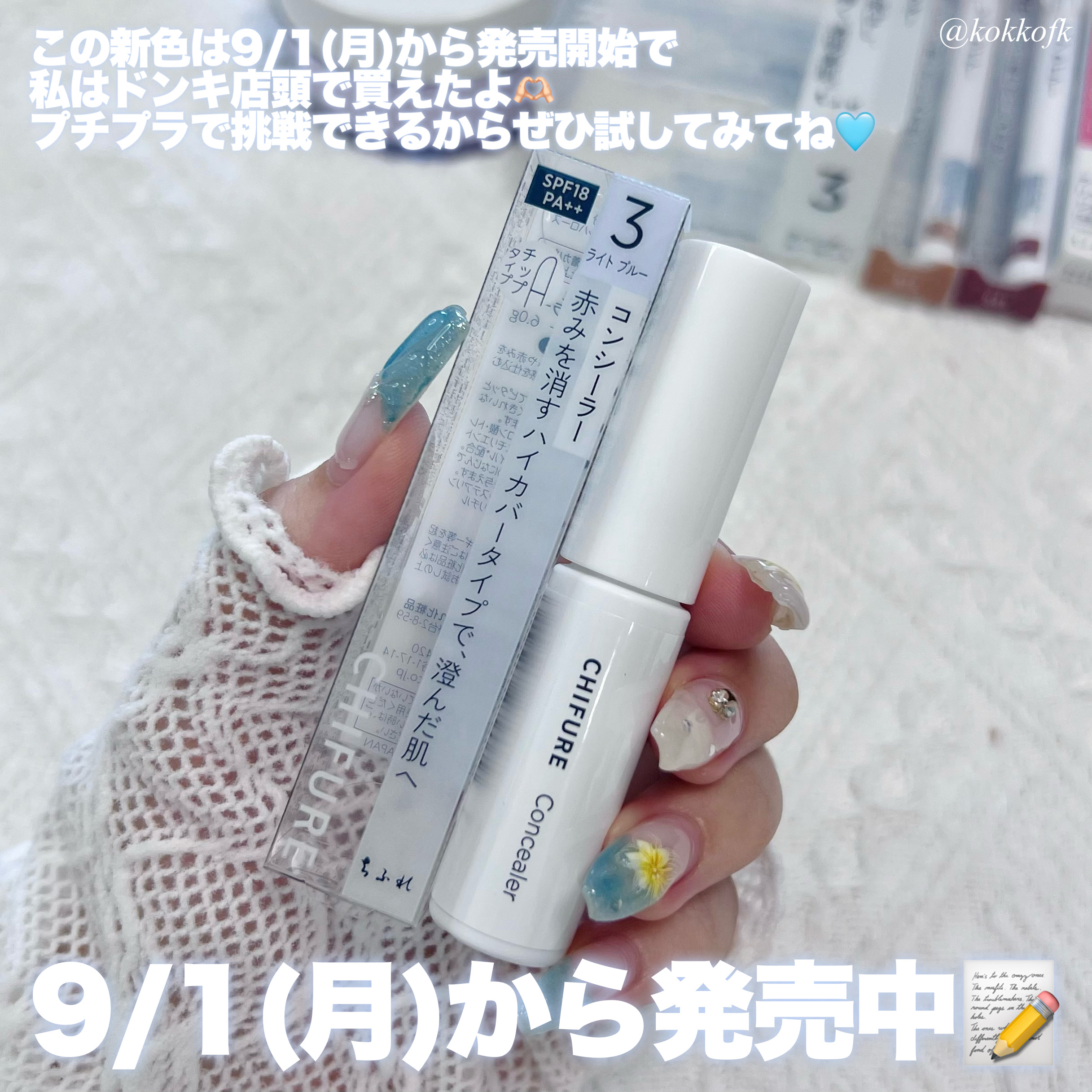 ちふれから寒色系ベースメイク🧊ブルーコンシーラー登場🩵✧ちふれコンシーラー3ライトブルーライトブルーカラーで肌トーンを明るく*見せてくれたりハイライトがわりに高く見せたい位置に仕込んだりできる!くすみや赤みを補正*してくれる。カバー力もカラー...