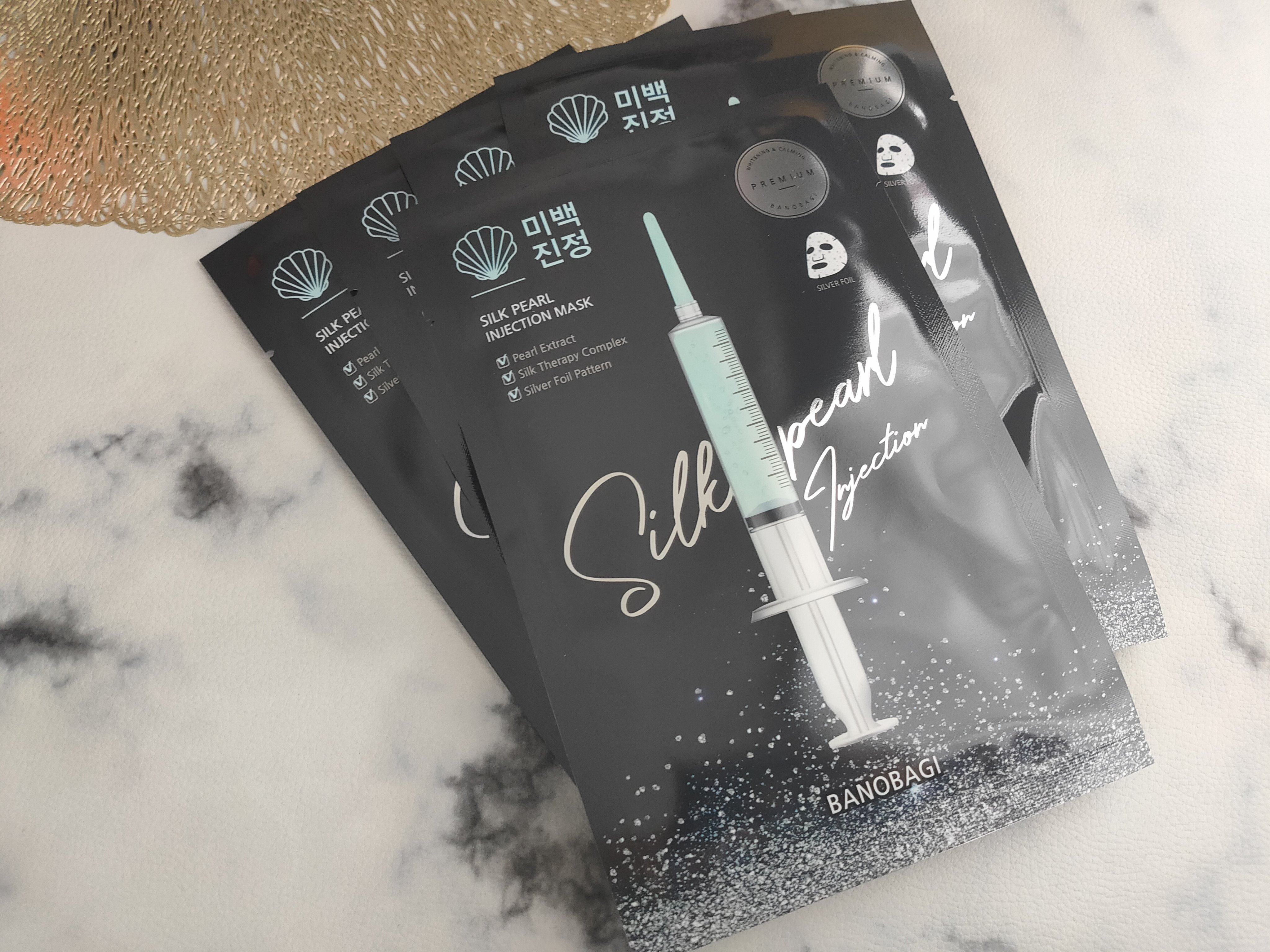 BANOBAGI様からいただきました。シルクパールプレミアムインジェクションマスクを使ってみました。インパクトある銀箔シートで、キラキラしている面が表面です。特殊なシートが採用されていて美容液が乾燥しにくくなっているそうです。シートはやわらか...