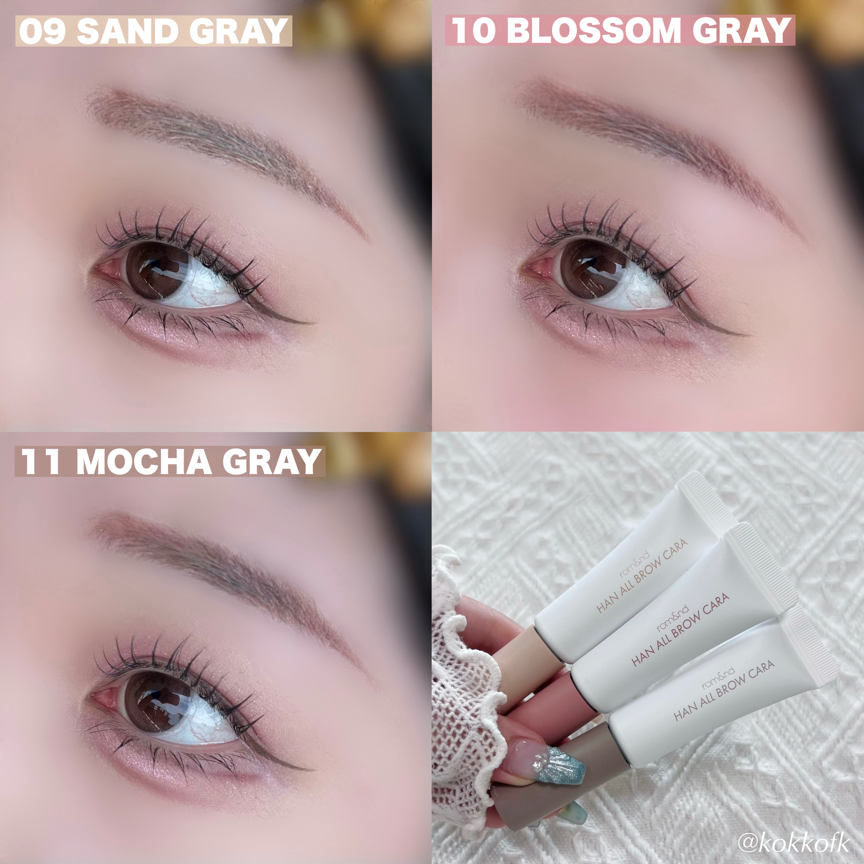 【#rom&nd/#ハンオールブロウカラ】11.モカグレーMOCHAGREY白みを感じるグレイッシュなカラーの眉マスカラ👀白みが自眉毛の黒さを抑えつつブラウングレイッシュの色味で自然に薄眉のような印象に仕上がると感じました!!色味もブラウンに...