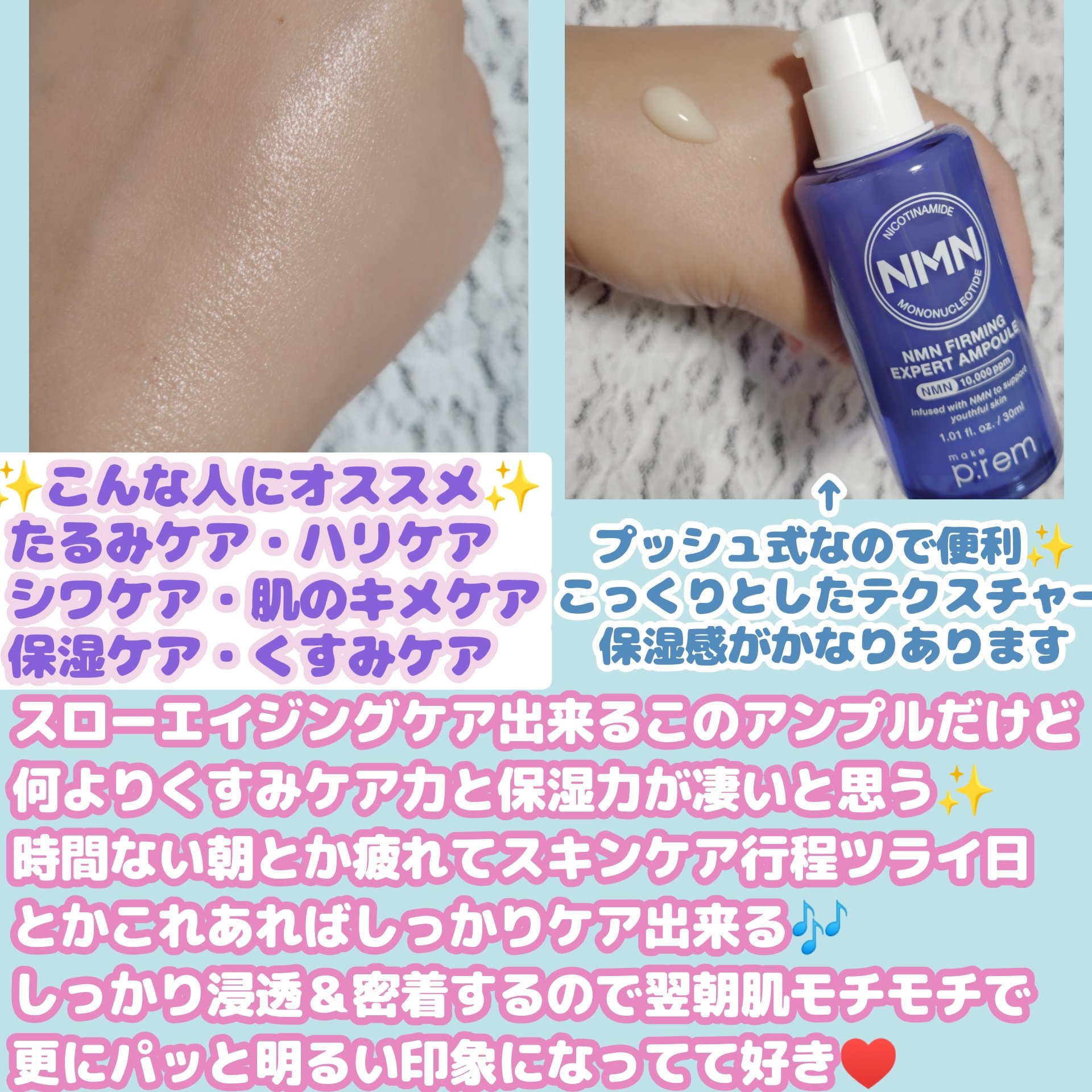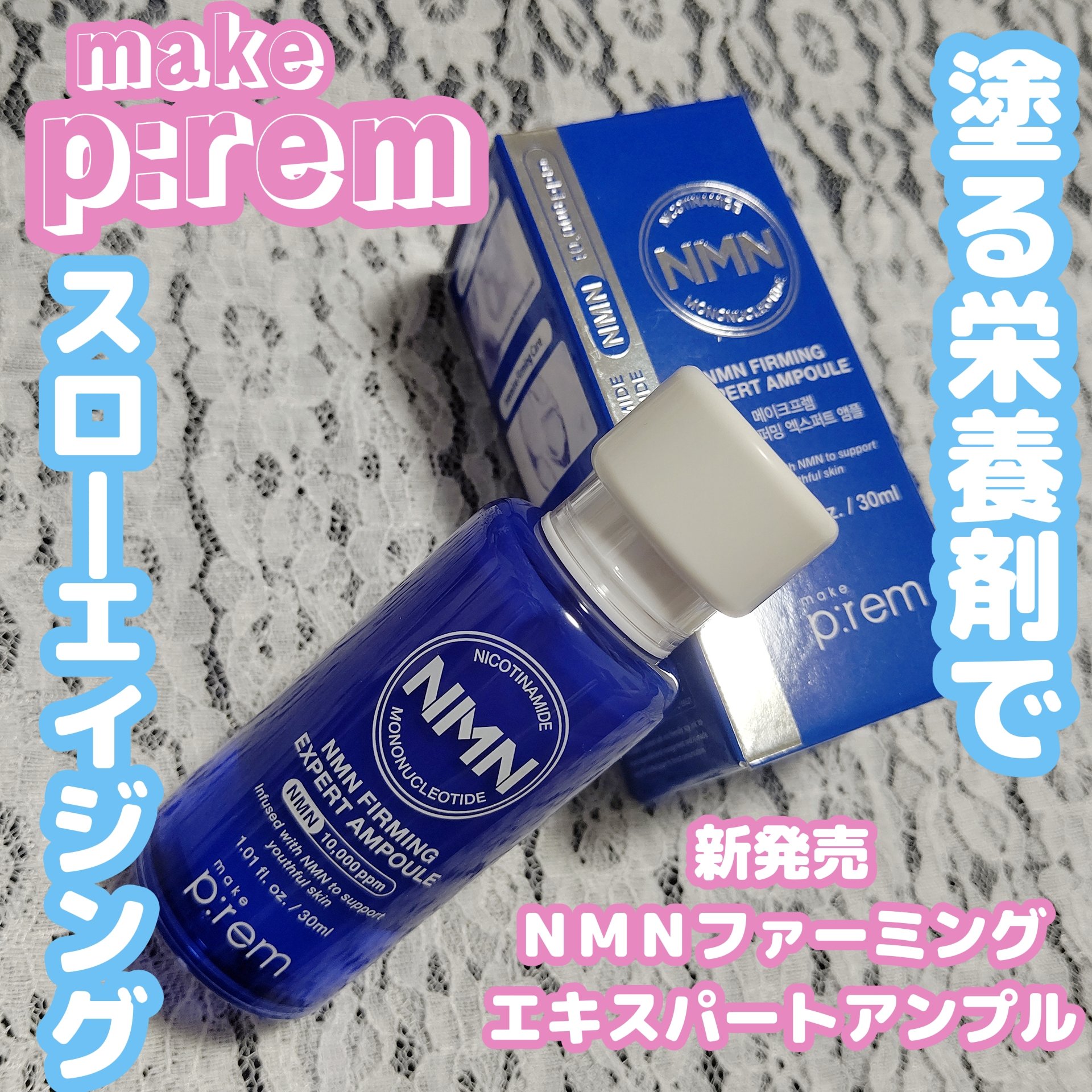 makepremNMNファーミングエキスパートアンプル 30ml 3700円新発売されたNMNファーミングエキスパートアンプルを使ってみました!シワ、くすみ、弾力ケアに!ミルクティーカラーの美容液はクリーミーで肌に伸ばしやすくてしっとり、...