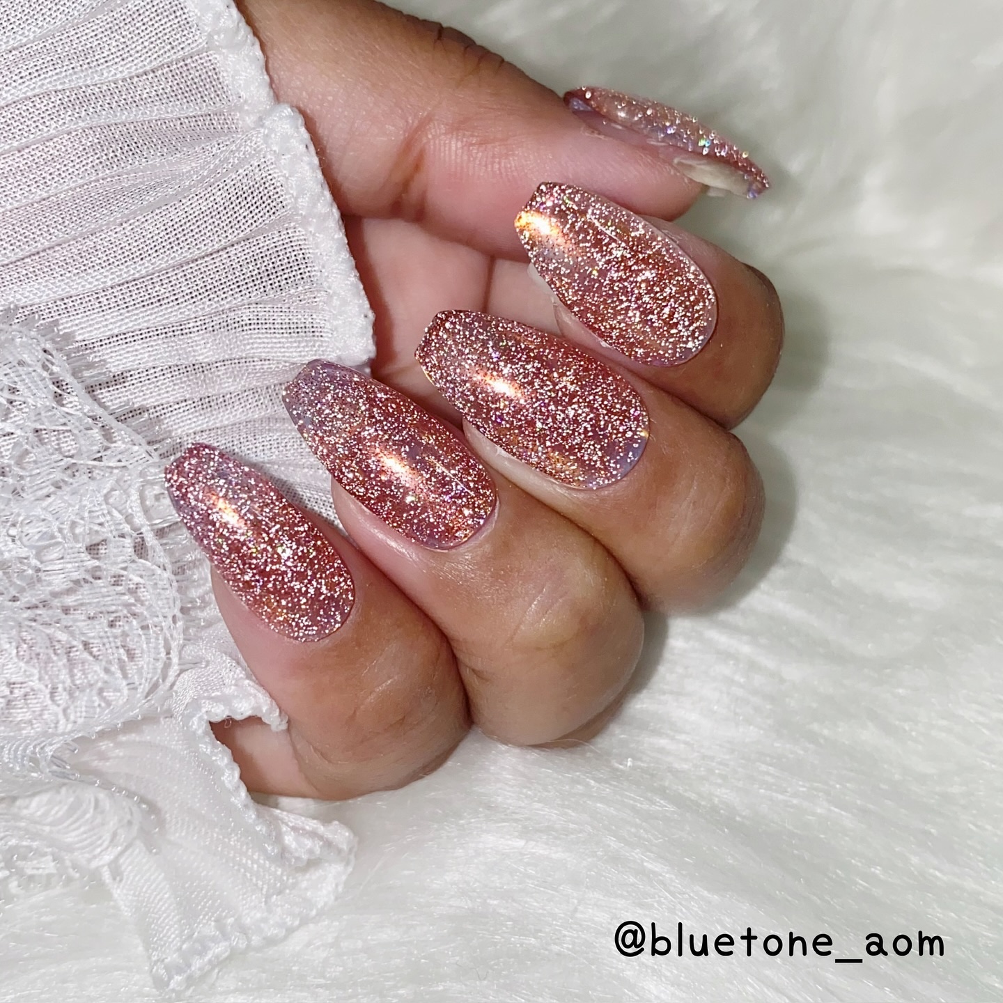 ラメがしっかりしてるし クリアカラーが入ってるから オーロラパウダー無しでも 充分キラキラしました! 反射強めのフィルムなので 実物はもっと うるうるとキラキラが強いです! ビー玉みたい🥺 ネイルシール長持ちさせたいけど ちょっと飽きてきたな〜って時とかに 全然違った印象になるのでオススメです! Seriaのベースジェル 本当にうるうるネイルしやすいので オススメしたい🙆♀️