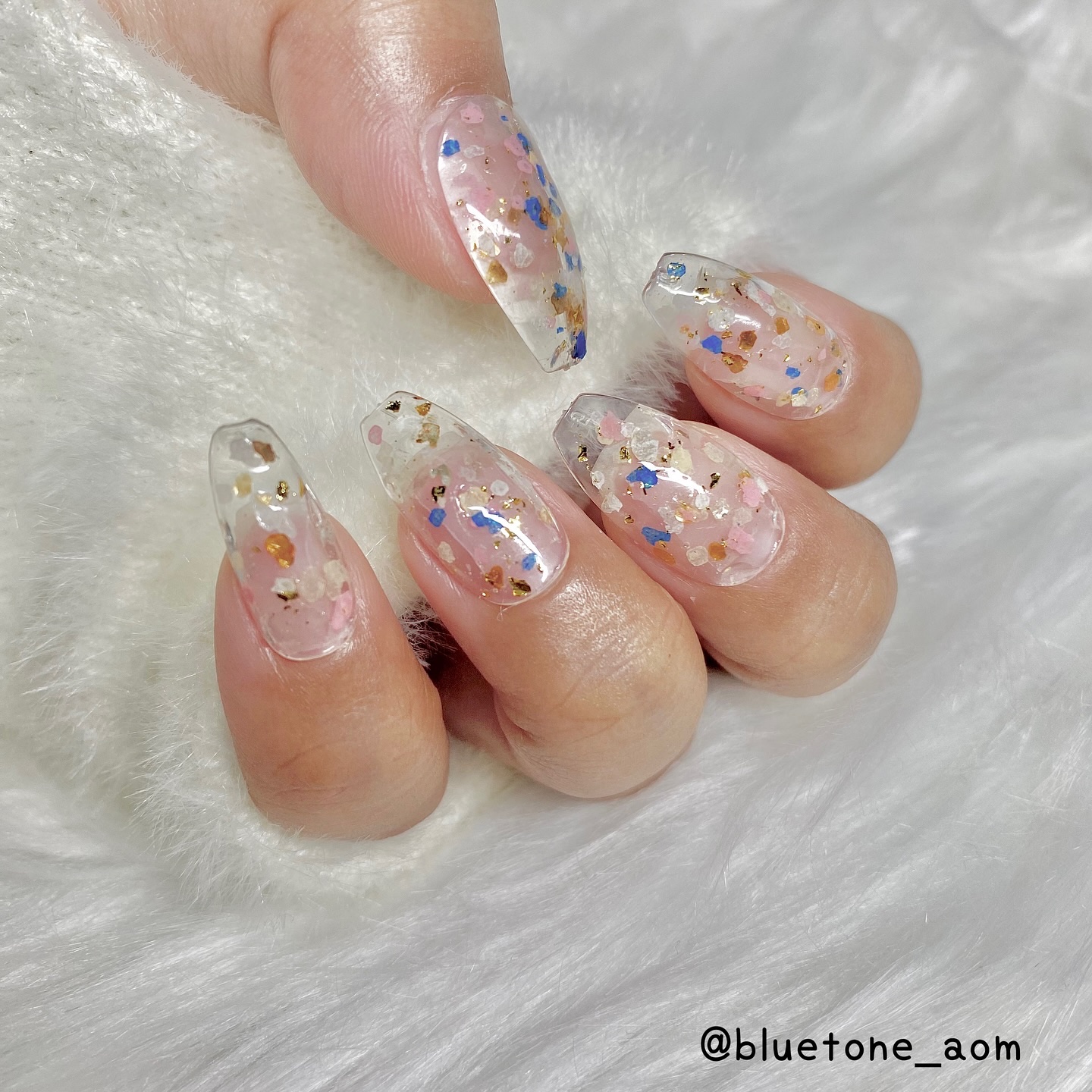 ラメがしっかりしてるし クリアカラーが入ってるから オーロラパウダー無しでも 充分キラキラしました! 反射強めのフィルムなので 実物はもっと うるうるとキラキラが強いです! ビー玉みたい🥺 ネイルシール長持ちさせたいけど ちょっと飽きてきたな〜って時とかに 全然違った印象になるのでオススメです! Seriaのベースジェル 本当にうるうるネイルしやすいので オススメしたい🙆♀️