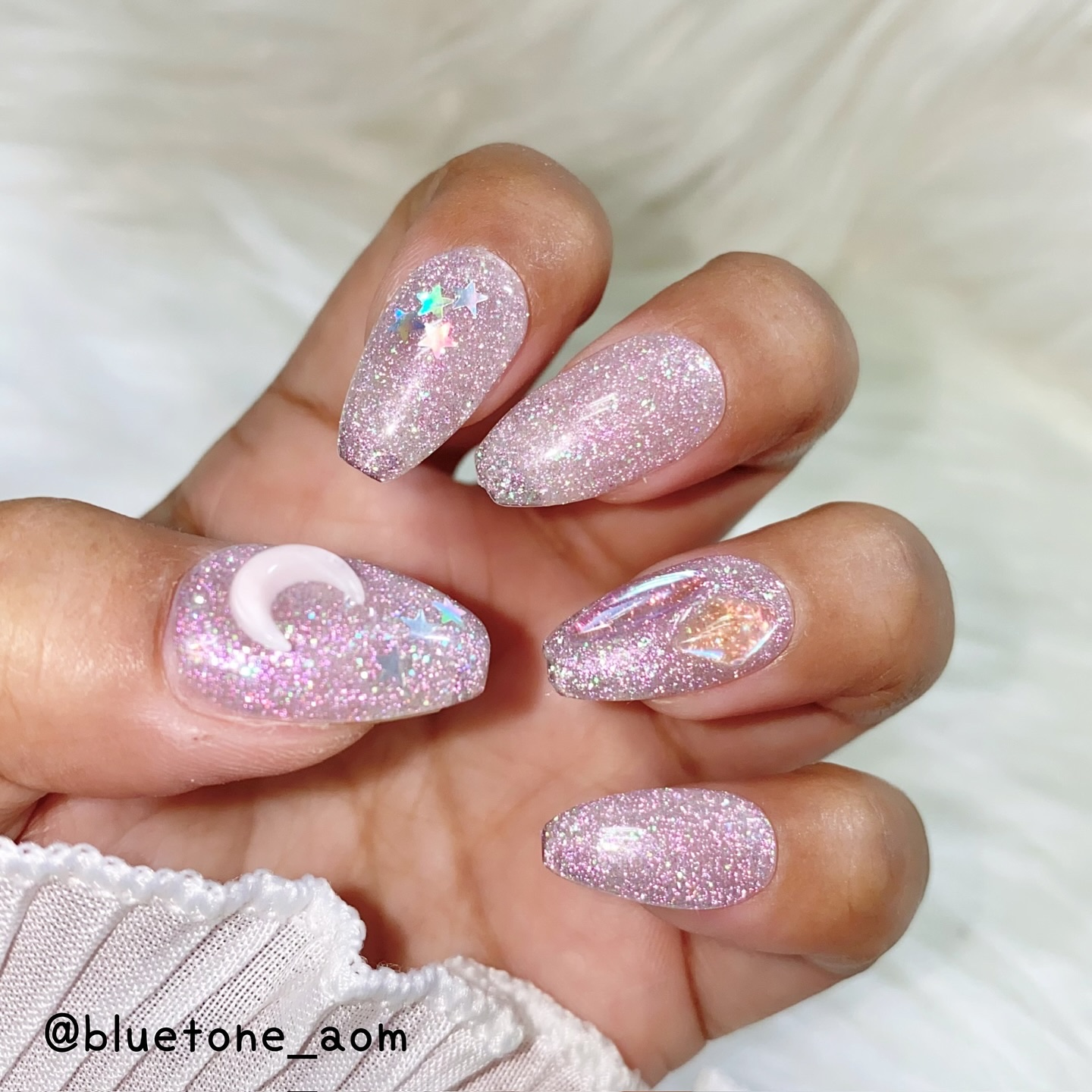 ラメがしっかりしてるし クリアカラーが入ってるから オーロラパウダー無しでも 充分キラキラしました! 反射強めのフィルムなので 実物はもっと うるうるとキラキラが強いです! ビー玉みたい🥺 ネイルシール長持ちさせたいけど ちょっと飽きてきたな〜って時とかに 全然違った印象になるのでオススメです! Seriaのベースジェル 本当にうるうるネイルしやすいので オススメしたい🙆♀️