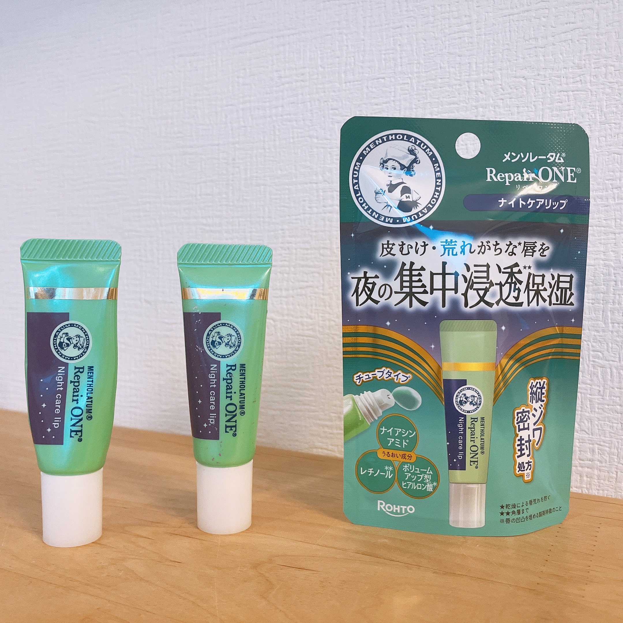 - ※商品パッケージは予告なく変更する場合がありますのでご了承ください。 「メンソレータム リペアワン ナイトケアリップ」は夜塗って集中浸透*1、3つの美容液成分(うるおい成分)配合で保湿パックできるリップエッセンスです。 唇をすこやかに保って荒れを防ぎ、ふっくらとうるおいのある唇に導いてくれます。 さらに、チューブタイプで使いやすく、のびがよく唇の凹凸を埋める縦ジワ密封処方*2も特徴的。 夜塗ってふっくらうるおった唇を叶えます。 *1角層まで *2唇の凹凸を埋める製剤特徴のこと