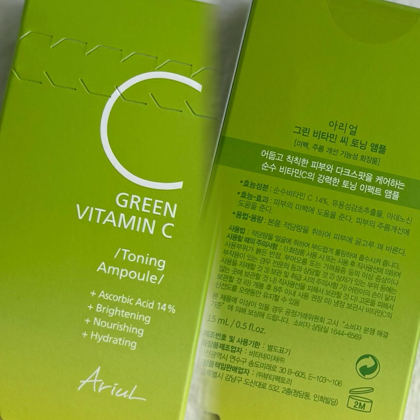 #Ariul☑︎#グリーンビタミンCトーニングアンプル誘導体X、純粋ビタミン配合(整肌成分)パンテノール、アルギニン、ヒアルロン酸Naとトリプル保湿成分配合でしっとり肌に。.。:+*゚ビタミンC特有のベタつきが少なくて(ベタベタ使用感が大の苦...