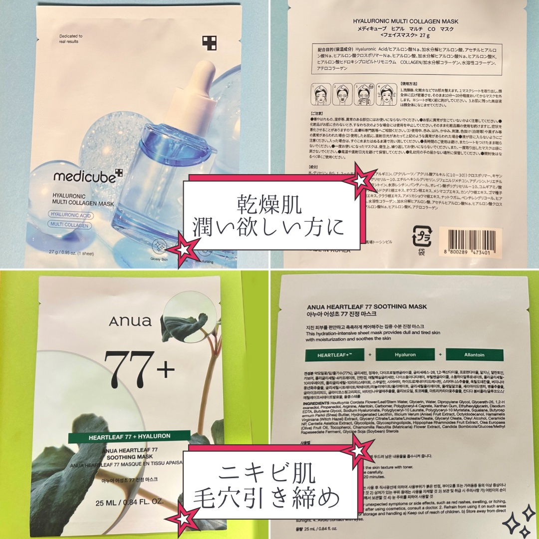 ナンバーズイン人気のパック5種使ってみたまとめ◎【numbuzin】💚1番ヒノキ水81%シートマスク驚きの糸引くパック。ヒノキの香りが心地良い〜🩷2番うるもち65%コラーゲンシートマスクゼリーみたいにぷるぷるなマスク。乾燥が気になるときに◎❤...