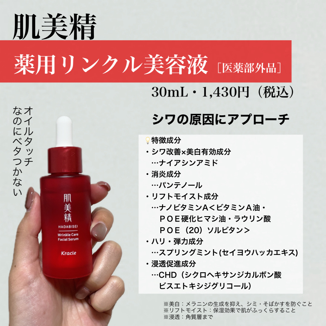 #PR肌美精様⌇薬用リンクル美容液[医薬部外品]肌美精の薬用シリーズから今年発売された赤の美容液⸜❤️⸝W有効成分ナイアシンアミド&パンテノール配合でシワの原因からアプローチ透明でさらりとしたオイルのようなテクスチャー。油分...