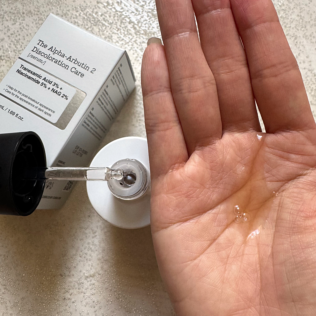 6種類の成分(アルファアルブチン・ナイアシンアミド・トラネキサム酸・アセチルグルコサミン・フェルラ酸・グルタチオン)で色素沈着ケアをしてくれる美容液です。 刺激で敏感になったお肌をケアする成分(5種ヒアルロン酸・パンテノール・トコフェロール・マデカッソシド・アラントイン)も配合で、色素沈着と肌荒れを同時にケア! 薄い赤褐色のサラサラのテクスチャーで肌馴染みがいいです。さっぱりした仕上がりで、メイクの邪魔をせず朝にも使いやすいです😊