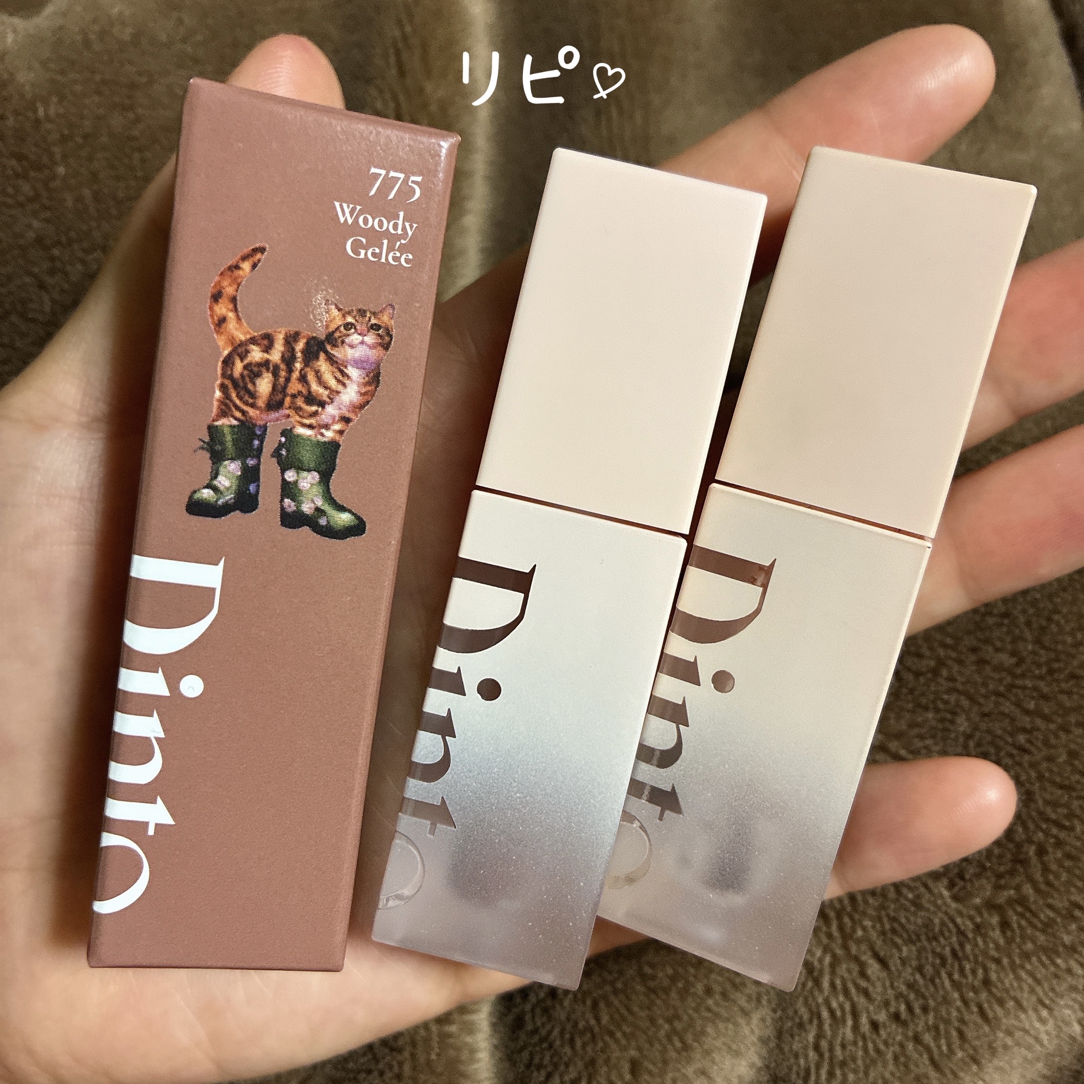 仕上がりぷるんっぷっくりなリップ💭 最初ちょっと白みっぽさがあるけど、10分程度待つとなじんで可愛さ増す⤴︎︎⤴︎ (775)Woody Gelée 猫のほのかなミューティッドウッディピンクゼリのカラー 透け感発色だからどんなメイクにも◎ イエベ秋・ブラウン好き民は(775)ぴったり🥺!!