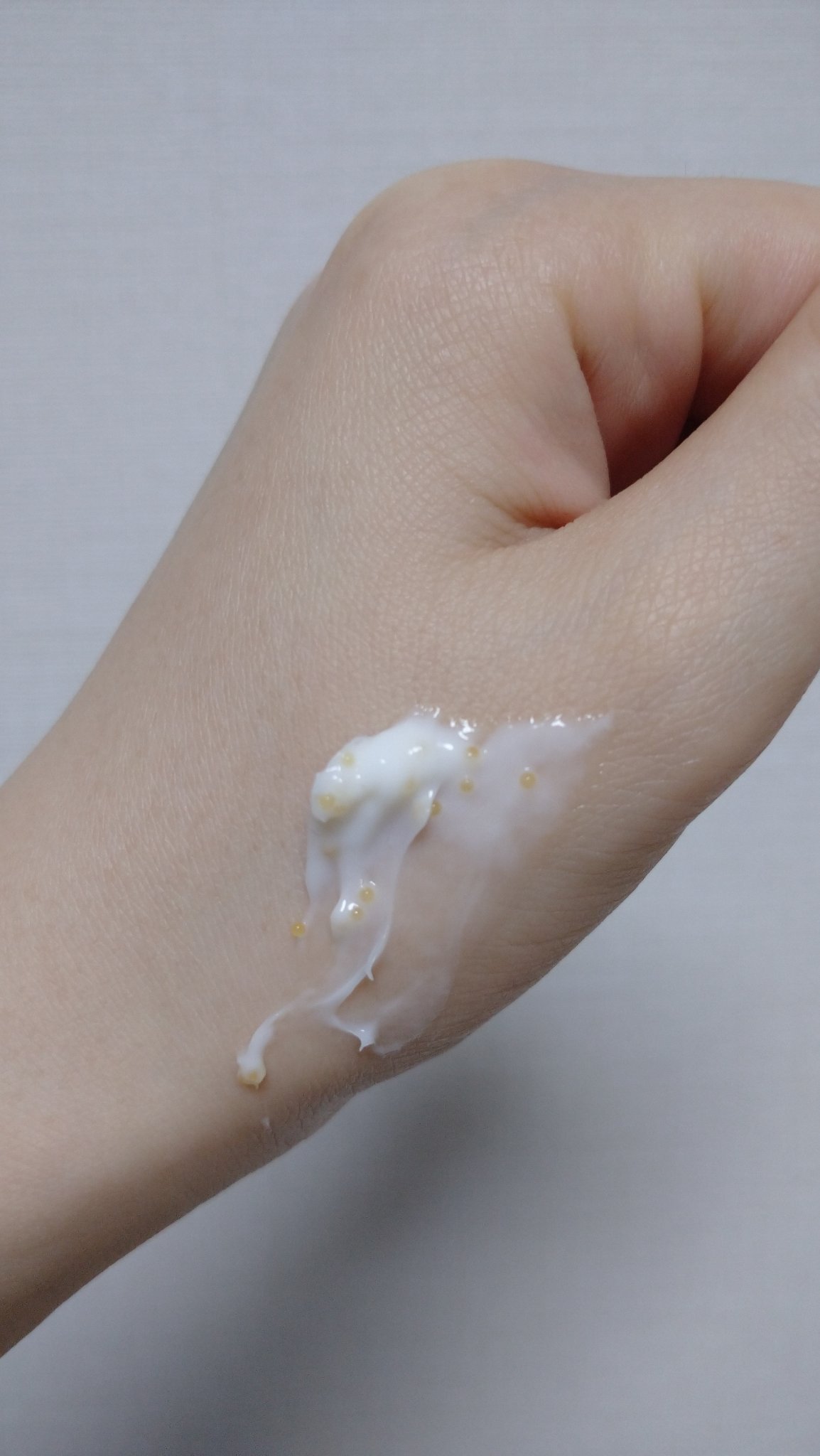 ジェルとクリームの中間のようなテクスチャーで、ピタッと定着してくれます。 サラッとしすぎず、ペタペタ感は残ります。 花のような香りがしますが、塗り終わると香りも気にならなくなります。