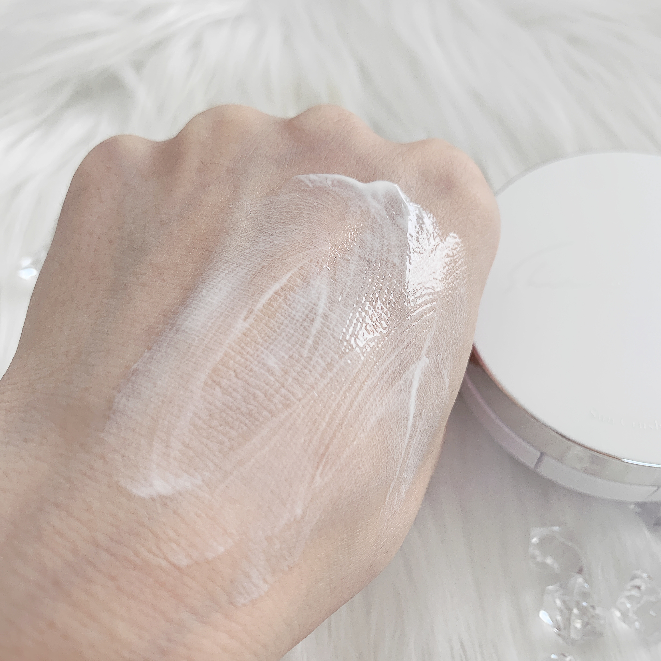手が汚れないので便利です 衛生的(o^^o) 2プッシュで顔全体塗ってます 中身はシロノサクラで売ってる日焼け止めクリームが入ってます(o^^o) 容器の大きさは他のクッションファンデーションと同じくらいのサイズ感です