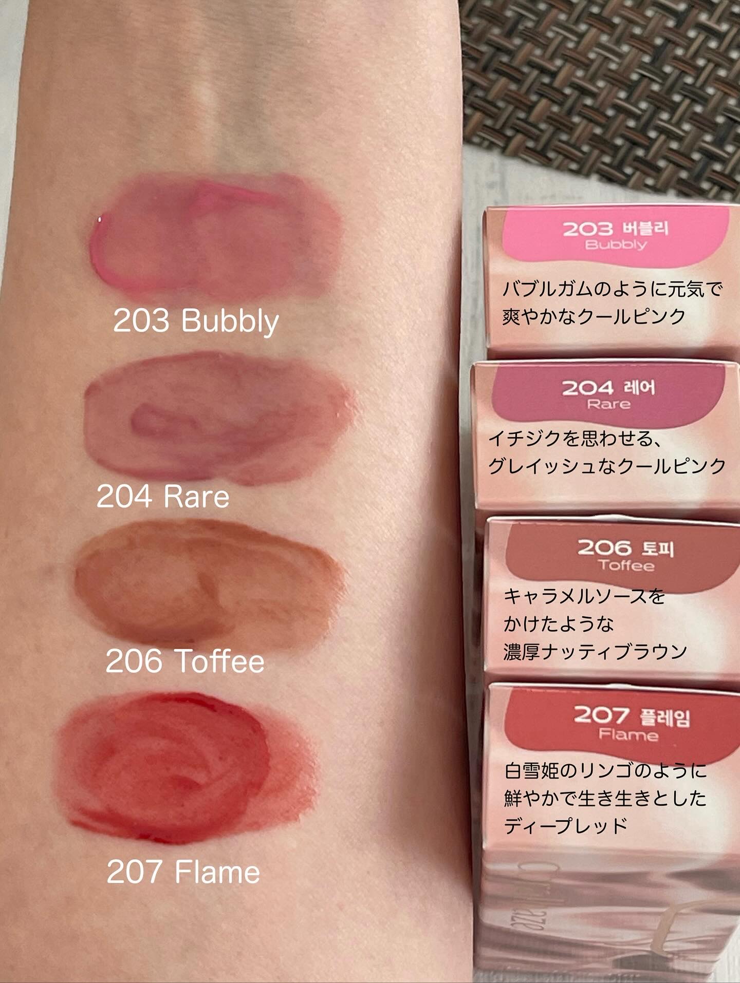 - <201 フェアリー> ダイマージリノール酸ジイソステアリル、ジフェニルシロキシフェニルトリメチコン、ビスジグリセリルポリアシルアジペート-2、水、ジフェニルジメチコン、水添ポリイソブテン、セチルPEG/PPG-10/1ジメチコン、ポリソルベート60、ペンチレングリコール、グリセリン、イソステアリン酸ポリグリセリル-4、フェノキシエタノール、1,2-ヘキサンジオール、セテアレス-20、酸化チタン (CI 77891)、(アクリル酸ヒドロキシエチル/アクリロイルジメチルタウリンNa)コポリマー、ステビオシド、スクワラン、香料、ジラウラミドグルタミドリシンNa、エチルヘキシルグリセリン、エチレンジアミンジコハク酸3Na、赤色227号 (CI 17200)、水酸化Al、黄色5号 (CI 15985)、ポリアクリル酸アンモニウム、イソステアリン酸ソルビタン、黄色4号 (CI 19140)、BG、赤色223号 (CI 45410)、青色1号 (CI 42090)、アラントイン、パンテノール、ツボクサエキス、ヒアルロン酸、加水分解ヒアルロン酸、ヒアルロン酸Na <203 バブリー> ダイマージリノール酸ジイソステアリル、ジフェニルシロキシフェニルトリメチコン、ビスジグリセリルポリアシルアジペート-2、水、ジフェニルジメチコン、水添ポリイソブテン、セチルPEG/PPG-10/1ジメチコン、ポリソルベート60、ペンチレングリコール、グリセリン、イソステアリン酸ポリグリセリル-4、フェノキシエタノール、1,2-ヘキサンジオール、セテアレス-20、(アクリル酸ヒドロキシエチル/アクリロイルジメチルタウリンNa)コポリマー、ステビオシド、酸化チタン (CI 77891)、スクワラン、香料、ジラウラミドグルタミドリシンNa、エチルヘキシルグリセリン、赤色227号 (CI 17200)、エチレンジアミンジコハク酸3Na、黄色5号 (CI 15985)、イソステアリン酸ソルビタン、水酸化Al、ポリアクリル酸アンモニウム、黄色4号 (CI 19140)、BG、青色1号 (CI 42090)、アラントイン、パンテノール、ツボクサエキス、ヒアルロン酸、加水分解ヒアルロン酸、ヒアルロン酸Na <204 レア> ダイマージリノール酸ジイソステアリル、ジフェニルシロキシフェニルトリメチコン、ビスジグリセリルポリアシルアジペート-2、水、ジフェニルジメチコン、水添ポリイソブテン、セチルPEG/PPG-10/1ジメチコン、ポリソルベート60、ペンチレングリコール、グリセリン、イソステアリン酸ポリグリセリル-4、フェノキシエタノール、1,2-ヘキサンジオール、セテアレス-20、(アクリル酸ヒドロキシエチル/アクリロイルジメチルタウリンNa)コポリマー、酸化チタン (CI 77891)、ステビオシド、スクワラン、香料、ジラウラミドグルタミドリシンNa、エチルヘキシルグリセリン、赤色227号 (CI 17200)、黄色5号 (CI 15985)、エチレンジアミンジコハク酸3Na、イソステアリン酸ソルビタン、水酸化Al、ポリアクリル酸アンモニウム、黄色4号 (CI 19140)、青色1号 (CI 42090)、BG、アラントイン、パンテノール、ツボクサエキス、ヒアルロン酸、加水分解ヒアルロン酸、ヒアルロン酸Na <205 ハニーデュー> ダイマージリノール酸ジイソステアリル、ジフェニルシロキシフェニルトリメチコン、ビスジグリセリルポリアシルアジペート-2、水、ジフェニルジメチコン、水添ポリイソブテン、セチルPEG/PPG-10/1ジメチコン、ポリソルベート60、ペンチレングリコール、グリセリン、イソステアリン酸ポリグリセリル-4、フェノキシエタノール、1,2-ヘキサンジオール、セテアレス-20、(アクリル酸ヒドロキシエチル/アクリロイルジメチルタウリンNa)コポリマー、酸化チタン (CI 77891)、ステビオシド、スクワラン、香料、ジラウラミドグルタミドリシンNa、エチルヘキシルグリセリン、赤色227号 (CI 17200)、黄色5号 (CI 15985)、エチレンジアミンジコハク酸3Na、イソステアリン酸ソルビタン、水酸化Al、ポリアクリル酸アンモニウム、黄色4号 (CI 19140)、青色1号 (CI 42090)、BG、アラントイン、パンテノール、ツボクサエキス、ヒアルロン酸、加水分解ヒアルロン酸、ヒアルロン酸Na <206 トフィー> ダイマージリノール酸ジイソステアリル、ジフェニルシロキシフェニルトリメチコン、ビスジグリセリルポリアシルアジペート-2、水、ジフェニルジメチコン、水添ポリイソブテン、セチルPEG/PPG-10/1ジメチコン、ポリソルベート60、ペンチレングリコール、グリセリン、イソステアリン酸ポリグリセリル-4、フェノキシエタノール、1,2-ヘキサンジオール、セテアレス-20、(アクリル酸ヒドロキシエチル/アクリロイルジメチルタウリンNa)コポリマー、ステビオシド、スクワラン、香料、ジラウラミドグルタミドリシンNa、酸化チタン (CI 77891)、エチルヘキシルグリセリン、黄色5号 (CI 15985)、エチレンジアミンジコハク酸3Na、黄色4号 (CI 19140)、赤色227号 (CI 17200)、イソステアリン酸ソルビタン、赤色223号 (CI 45410)、青色1号 (CI 42090)、水酸化Al、ポリアクリル酸アンモニウム、BG、アラントイン、パンテノール、ツボクサエキス、ヒアルロン酸、加水分解ヒアルロン酸、ヒアルロン酸Na <207 フレイム> ダイマージリノール酸ジイソステアリル、ジフェニルシロ