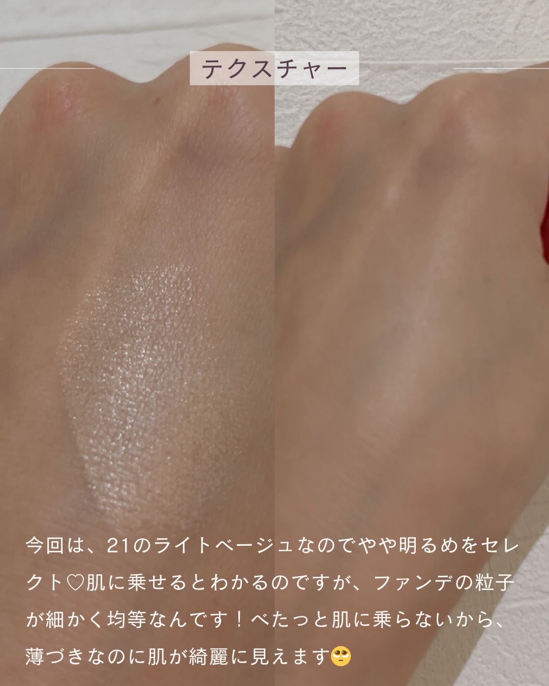 - <#21 ライトベージュ> 水、酸化チタン、ジメチコン、ジフェニルシロキシフェニルトリメチコン、フェニルトリメチコン、ジ(カプリル/カプリン酸)BG、トリメリト酸トリトリデシル、メチルトリメチコン、BG、ラウリルPEG-9ポリジメチルシロキシエチルジメチコン、グリセリン、ナイアシンアミド、ペンチレングリコール、セレシン、トリ(ベヘン酸/イソステアリン酸/エイコサン二酸)グリセリル、酸化鉄、水添ロジン酸メチル、PEG-10ジメチコン、硫酸Mg、フェノキシエタノール、ジステアルジモニウムヘクトライト、合成フルオロフロゴパイト、(アクリレーツ/ジメチコン)コポリマー、ジメチコンクロスポリマー、水酸化Al、ステアリン酸、トリエトキシカプリリルシラン、アルミナ、香料、エチルヘキシルグリセリン、アデノシン、エチレンジアミンジコハク酸3Na、トコフェロール、ダイサンチクエキス、メチルプロパンジオール、1,2-ヘキサンジオール <#23 ナチュラルベージュ> 水、酸化チタン、ジメチコン、ジフェニルシロキシフェニルトリメチコン、フェニルトリメチコン、ジ(カプリル/カプリン酸)BG、トリメリト酸トリトリデシル、メチルトリメチコン、BG、ラウリルPEG-9ポリジメチルシロキシエチルジメチコン、酸化鉄、グリセリン、ナイアシンアミド、ペンチレングリコール、セレシン、トリ(ベヘン酸/イソステアリン酸/エイコサン二酸)グリセリル、合成フルオロフロゴパイト、水添ロジン酸メチル、PEG-10ジメチコン、硫酸Mg、フェノキシエタノール、ジステアルジモニウムヘクトライト、(アクリレーツ/ジメチコン)コポリマー、トリエトキシカプリリルシラン、ジメチコンクロスポリマー、水酸化Al、ステアリン酸、アルミナ、香料、エチルヘキシルグリセリン、アデノシン、エチレンジアミンジコハク酸3Na、トコフェロール、ダイサンチクエキス、メチルプロパンジオール、1,2-ヘキサンジオール