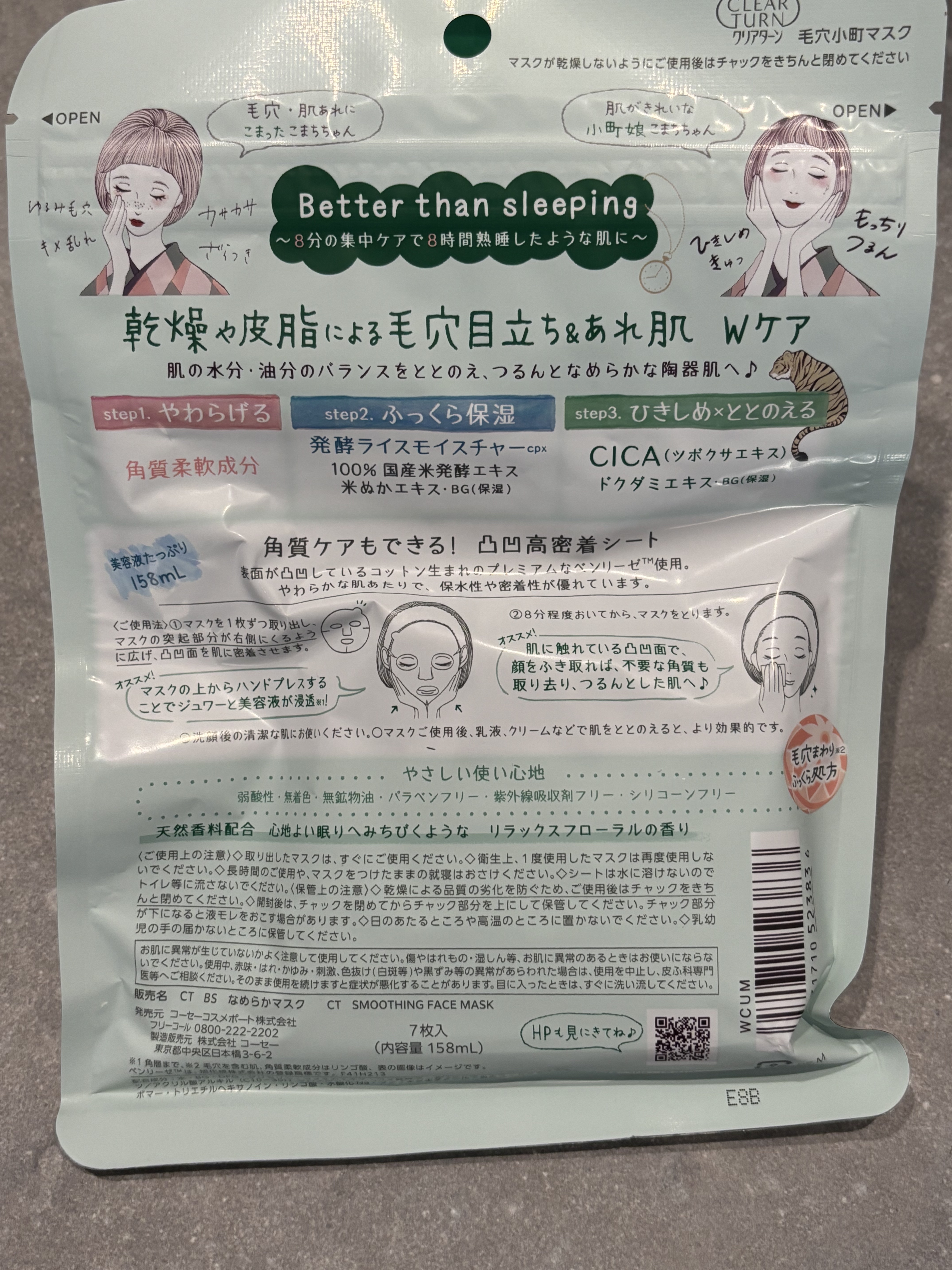 - 毛穴・肌あれが同時にケアできる、毛穴小町マスク! ①毛穴目立ち&肌あれをダブルでケア!なめらか陶器肌へ 水分・油分をバランスよく配合したみずみずしい美容液で、乾燥や皮脂による毛穴目立ちやあれ肌もケアします。キメのととのった、つるんとなめらかな陶器肌に導きます。 角質柔軟成分※3配合。肌をやわらげます。 100%国産米発酵エキス・米ぬかエキス・BG(保湿)をはじめとする発酵ライスモイスチャーCPX配合。ふっくらと保湿します。 ツボクサエキス・ドクダミエキス・BG(保湿)配合。ツボクサエキスは今話題のCICA成分です。肌をひきしめととのえます。 ※3 角質柔軟成分はリンゴ酸 ②角質ケアできる凸凹高密着シート コットン生まれでやわらかな肌触りの国産シートを採用。シートマスクの表面には凸凹のエンボス加工を施しているため、密着性が高く、はがしたマスクでやさしく顔をふきとることで角質ケアもできます。 ③心地よい眠りにみちびくようなリラックスフローラルの香り(天然香料配合) ④やさしい使い心地 弱酸性・無着色・無鉱物油・パラベンフリー・紫外線吸収剤フリー・シリコーンフリーのやさしい使い心地です。