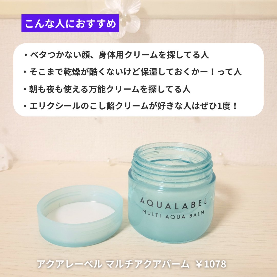 アクアレーベルマルチアクアバーム気になっていて購入😊本当にベトベトしなくてでもちゃんと保湿してくれてる感じもあるし肌ももちっと水分感あるような感じになる🙄‼️ベトベトしないのでベトベトのスキンケアが苦手の人は使いやすい使用感だしオススメしたい...