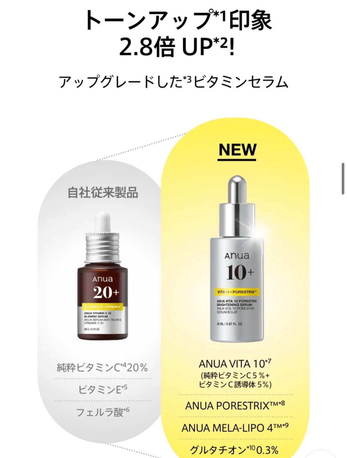 - ・ANUA VITA 10(ピュアビタミンC*¹ 5%+ビタミン誘導体3種*² 5%)とビタミンシナジー成分(グルタチオン*³ 3000ppm・ナイアシンアミド*⁴)の組み合わせで、明るく透明感のある肌印象*⁵へと導きます。 ・ 「ANUA PORESTRIX™*⁶(ポアストリクス)」により、毛穴が気になる肌の引き締め*⁷をサポート。 ・セラミド*⁸、パンテノール*⁹の配合で、ビタミン特有の刺激や乾燥感に配慮したやさしい使い心地。 ・乾燥によるくすみや毛穴の目立ちが気になる20〜40代の方におすすめ! *1 アスコルビン酸(整肌成分) *2 3-O-エチルアスコルビン酸、アスコルビルリン酸Na、アスコルビルグルコシド(全て整肌成分) *3 グルタチオン(整肌成分) *4 ナイアシンアミド(整肌成分) *5,7 うるおいで肌を整えることによる *6 ANUA PORESTRIX™:水、1,2-ヘキサンジオール、グリセリン、エチルヘキシルグリセリン、グリシルグリシン、タンニン酸、コラーゲン、ポリソルベート20、トリペプチド-1、ハナスゲ根エキス、ナイアシンアミド、ヘキサペプチド-9、パルミトイルトリペプチド-5、パルミトイルペンタペプチド-4、パルミトイルテトラペプチド-7(全て整肌成分) *8 セラミドNP(保湿成分) *9 パンテノール(整肌成分)