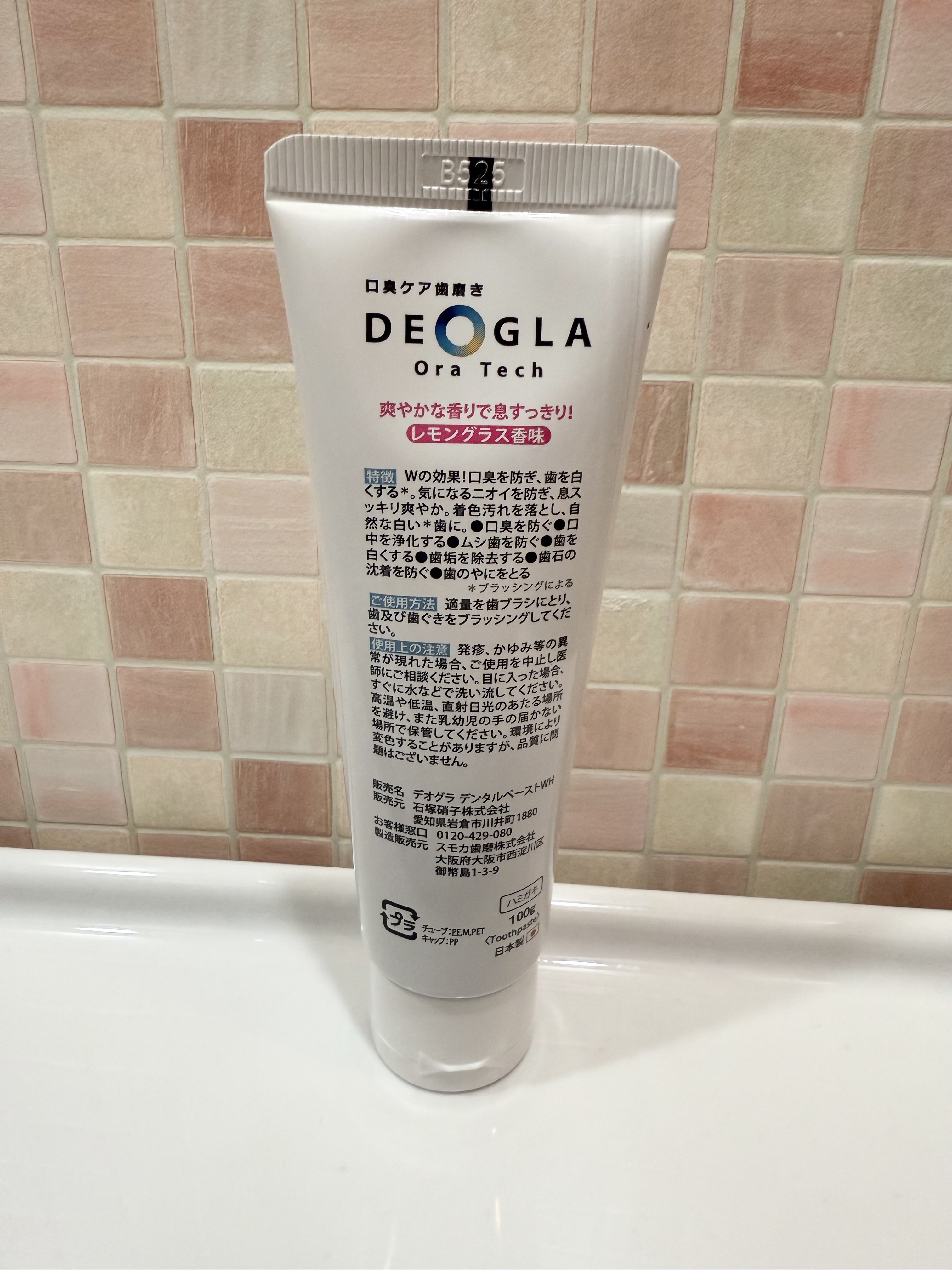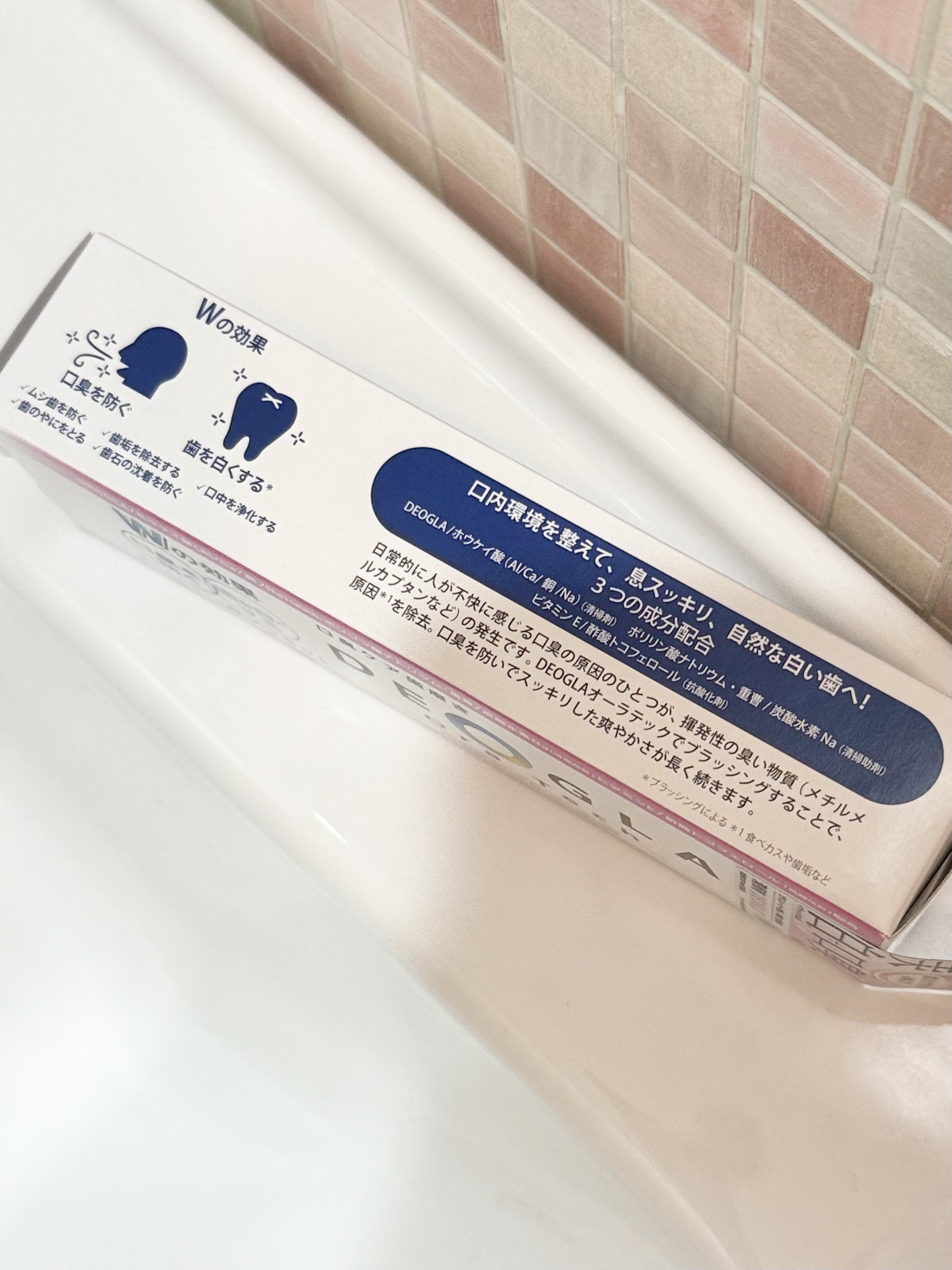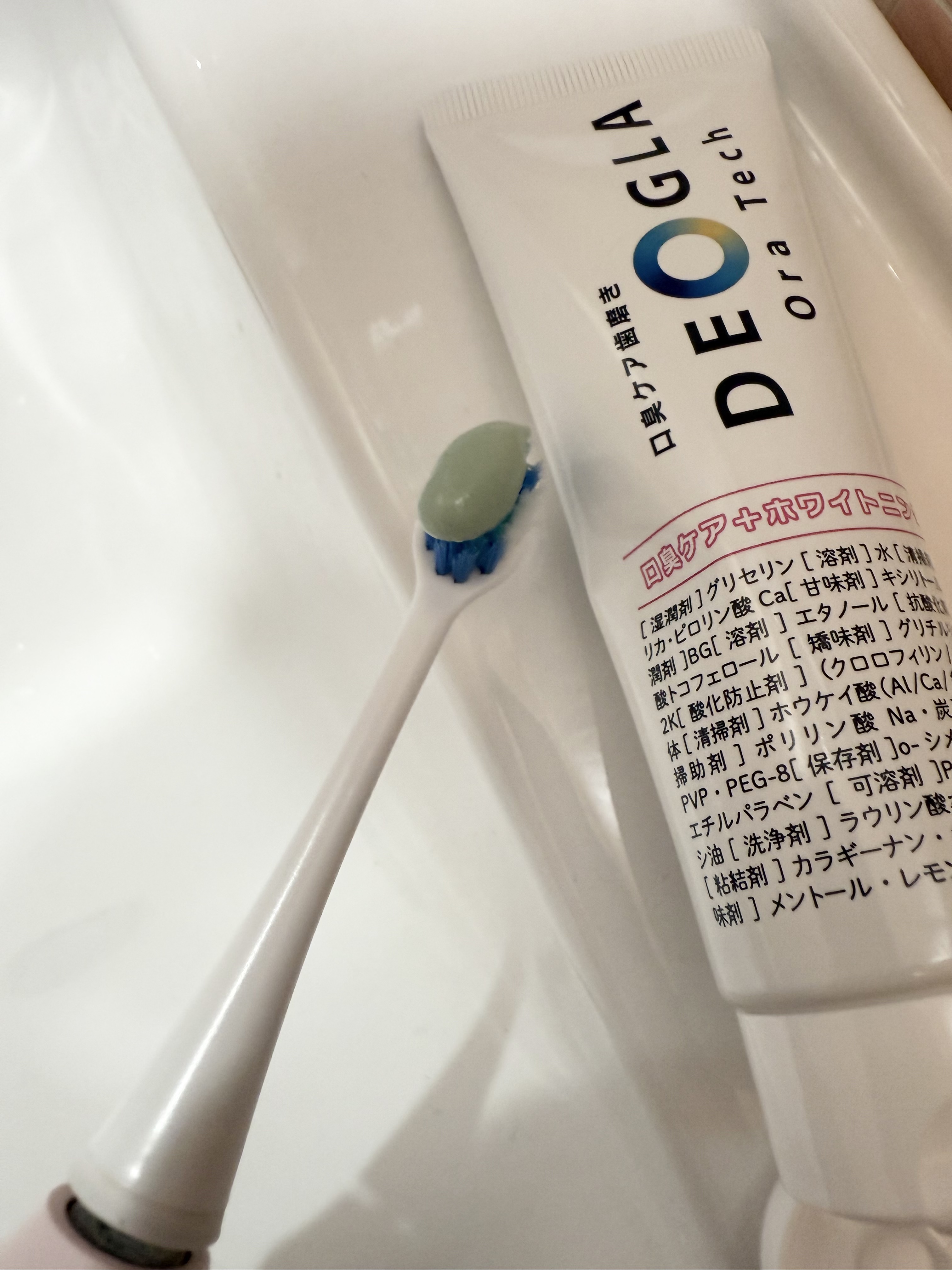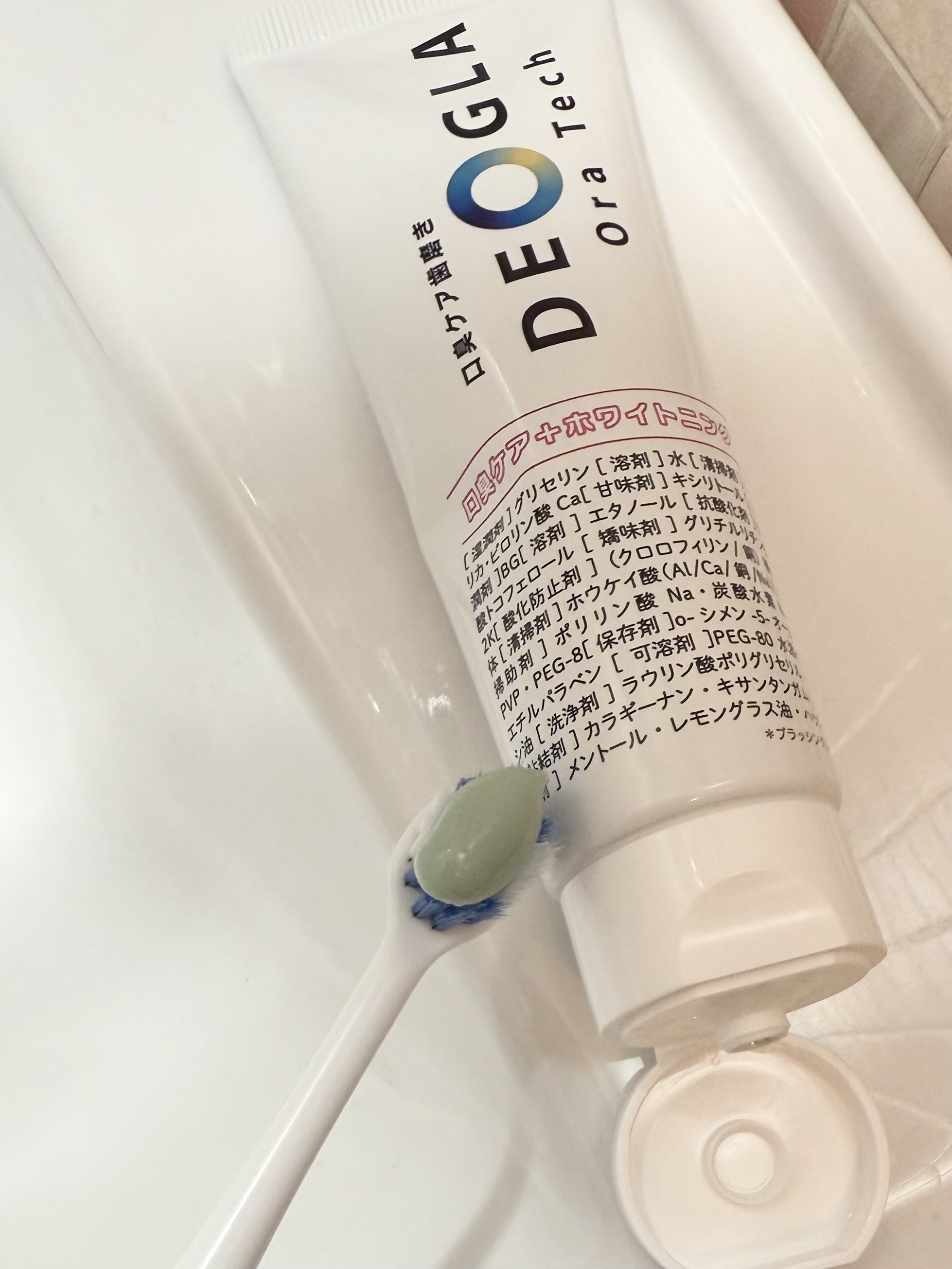 口臭ケアとホワイトニングがどっちも出来るのが嬉しいポイント。 今まではどっちかに特化したものを、朝と夜で分けて使ってたから嬉しい。 口臭ケアできるから、キツめのミントかなって思ってたけど、なんとレモングラス。 キツい味じゃないのがいいね。 メチルメルカプタンにアプローチする独自成分DEOGLA(ホウケイ酸(Al/Ca/銅/Na))が配合されているよ。