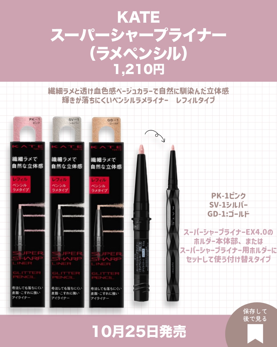 【KATE新色情報】10/25~アイシャドウ、リップ、アイブロウペンシル、アイライナーから新色登場✨️10/25から以下の4アイテムから新色が登場!📍ポッピングシルエットシャドウ全2種(限定)¥1,540📍リップモンスター クリスタルポッド全...