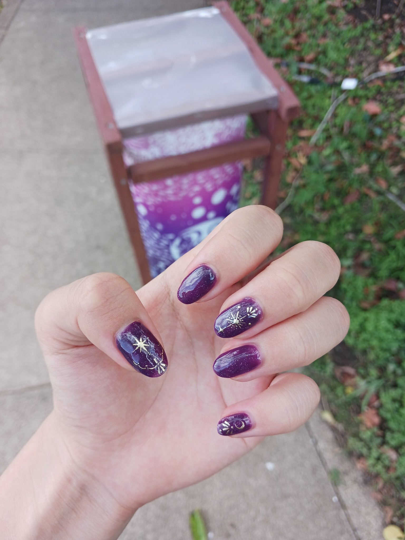 セリアのマグネットは動きが甘い。あと、gelism のマグネットと比べるとやはり輝きが見劣りする。だが、色はかわいいし、一つ目のようにステンドグラス風にする分には申し分ないクオリティだと思う。 同じくステンドグラスのやつで使っている nail town のGalaxy 04 と20はシルバーみがかかった粒子が特徴。Galaxy の名の通りの特徴的な輝きなので、お試しで数色かってみてもいいかもしれない。