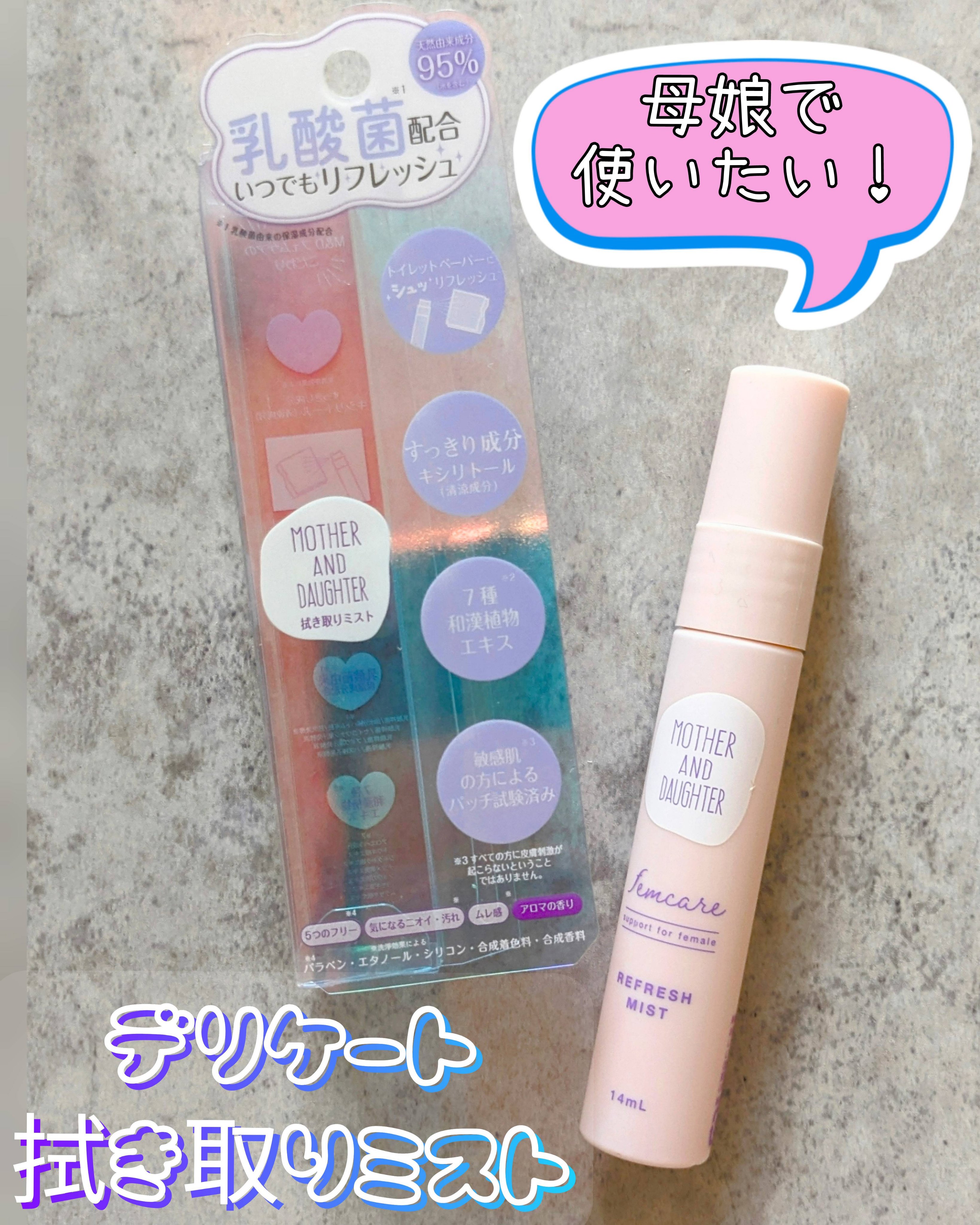 Mother&Daughterマザー&ドーターデリケート拭き取りミスト値段 ¥1,375☑️天然由来成分95%☑️乳酸菌配合☑️清涼成分キシリトール配合☑️敏感肌の方によるパッチテスト済み☑️アロマの香り子供から大人まで親子でフェムケアができ...