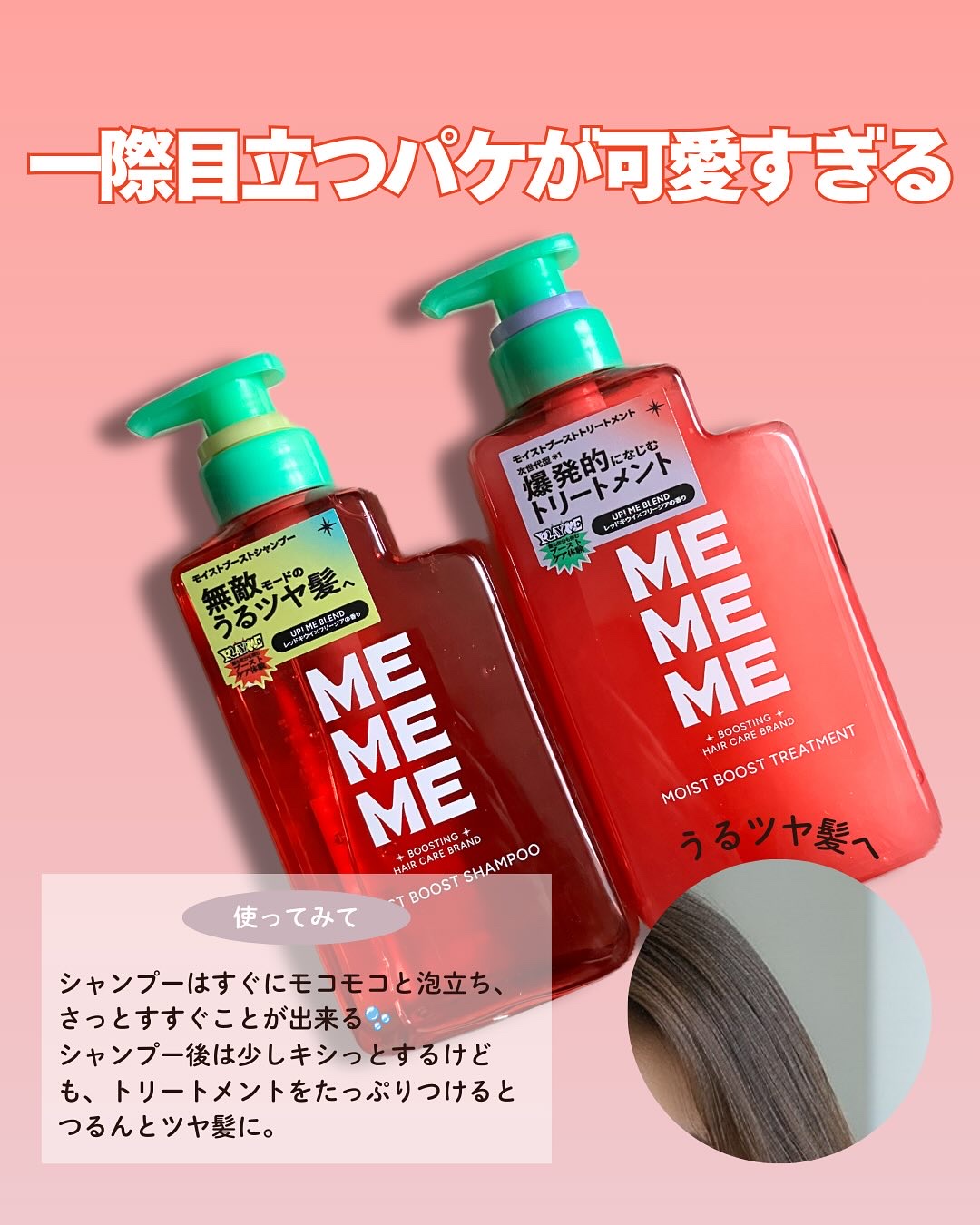 (MEMEME様よりご提供いただきました❤︎)MEMEMEミーミーミーモイストブーストシャンプーモイストブーストトリートメント各400ml/¥1,540(税込)NEW✨毛先までぷるんと弾む自身がみなぎるツヤ髪へ🌟✅モイストブーストシャンプー・...