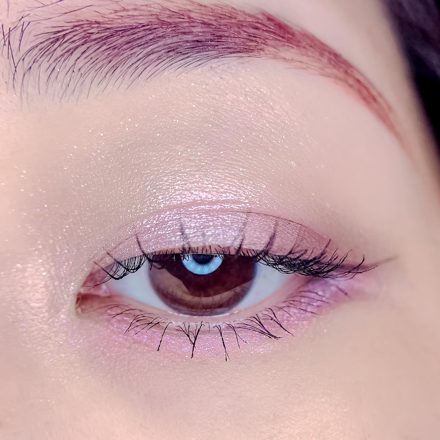 ベースに右上、目頭から黒目上に真ん中、黒目〜目尻に右下を、左上を目頭にくの字に塗ってもらいました✨ ピンクサクラよりもクールな感じで、目で見た色より私の肌では紫っぽく発色しました😍 上2つはラメはぎっしりでときめく💓 ブラウンメイクがとても苦手だけれどこれならブラウンメイク出来そう👌(かなり紫寄りですが) くすみ感は強いので苦手な方は厳しいかも…(特に真ん中) クールな印象になるので大人顔さん向けor大人顔になりたい方向けのイメージです✨