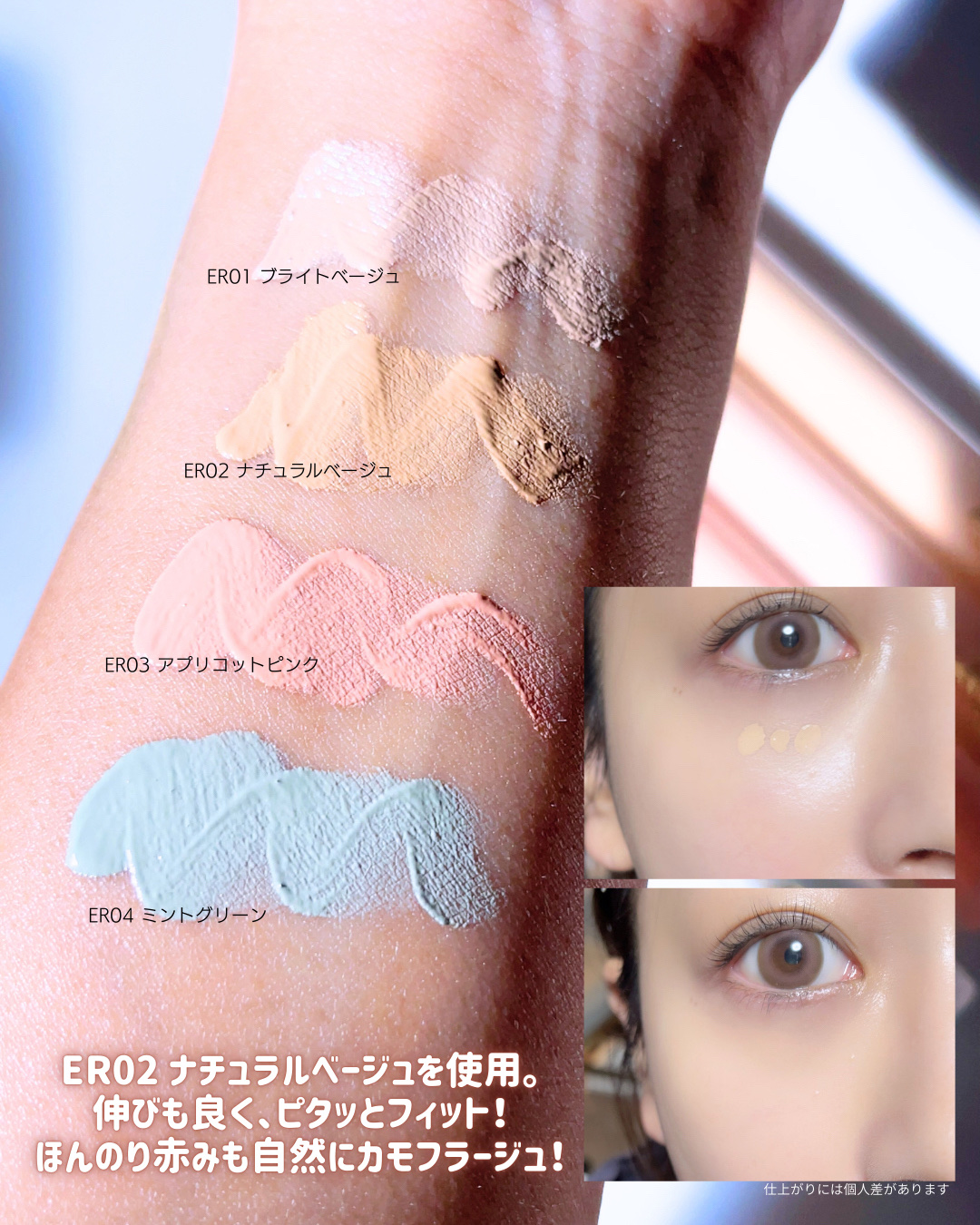 - <ER01 ブライトベージュ> 水、BG、ジフェニルシロキシフェニルトリメチコン、メチルトリメチコン、水添ポリデセン、プロパンジオール、マカデミア種子油、ラウリルPEG-9ポリジメチルシロキシエチルジメチコン、タルク、セスキイソステアリン酸ソルビタン、マルチトール、トリメチルシロキシケイ酸、3-0-エチルアスコルビン酸、ナイアシンアミド、ジペプチドー15、セラミドNG、セラミドNP、セラミドAP、アスコルビン酸、グルタチオン、ノイバラ果実エキス、シア、ジステアルジモニウムヘクトライト、テトライソステアリン酸ポリグリセリルー2、トリベヘニン、トリポリヒドロキシステアリン酸ジペンタエリスリチル、ハイドロゲンジメチコン、フィトステロールズ、塩化Na、水酸化AL、水添レシチン、クロルフェネシン、デヒドロ酢酸Na、フェノキシエタノール、マイカ、酸化チタン、酸化鉄 <ER02 ナチュラルベージュ> 水、BG、メチルトリメチコン、ジフェニルシロキシフェニルトリメチコン、水添ポリデセン、プロパンジオール、タルク、マカデミア種子油、ラウリルPEG-9ポリジメチルシロキシエチルジメチコン、セスキイソステアリン酸ソルビタン、マルチトール、トリメチルシロキシケイ酸、3-0-エチルアスコルビン酸、ナイアシンアミド、ジペプチドー15、セラミドNG、セラミドNP、セラミドAR、エクト イン、グリチルリチン酸2K、ノイバラ果実エキス、シア脂、ジステアルジモニウムヘクトライト、テトライソステアリン酸ポリグリセリルー2、トリベヘニン、トリポリヒドロキシステアリン酸ジペンタ エリスリチル、ハイドロゲンジメチコン、フィトステロールズ、塩化Na、水酸化Al、水添レシチン、クロルフェネシン、デヒドロ酢酸Na、フェノキシエタノール、酸化チタン、酸化鉄 <ER03 アプリコットピンク> 水、タルク、BG、メチルトリメチコン、ジフェニルシロキシフェニルトリメチコン、水添ポリデセン、プロパンジオール、マカデミア種子油、ラウリルPEG-9ポリジメチルシロキシエチルジメチコン、セスキイソステアリン酸ソルビタン、マルチトール、トリメチルシロキシケイ酸、3-0-エチルアスコルビン酸、ナイアシンアミド、ジペプチドー15、セラミドNG、セラミドNP、セラミドAP、酢酸トコフェロール、カフェイン、ノイバラ果実エキス、シア脂、ジステアルジモニウムヘクトライト、テトライソステアリン酸ポリグリセリルー2、トリベへニン、トリポリヒドロキシステアリン酸ジペンタエリスリ チル、ハイドロゲンジメチコン、フィトステロールズ、塩化Na、水酸化Al、水添レシチン、クロルフェネシン、デヒドロ酢酸Na、フェノキシエタノール、酸化チタン、酸化鉄 <ER04 ミントグリーン> 水、BG、タルク、メチルトリメチコン、ジフェニルシロキシフェニルトリメチコン、水添ポリデセン、プロパンジオール、マカデミア種子油、ラウリルPEG-9ポリジメチルシロキシエチルジメチコン、セスキイソステアリン酸ソルビタン、マルチトール、トリメチルシロキシケイ酸、3-0-エチルアスコルビン酸、ナイアシンアミド、ジペプチドー15、セラミドNG、セラミドNP、セラミドAP、ツボクサエキス、アゼロイルジグリシンK、ノイバラ果実エキス、シア脂、ジステアルジモニウムヘクトライト、テトライソステアリン酸ポリグリセリルー2、トリエトキシカプリリルシラン、トリベヘニン、トリポリヒドロキシステ アリン酸ジペンタエリスリチル、ハイドロゲンジメチコン、フィトステロールズ、塩化Na、水酸化AL、添レシチン、クロルフェネシン、デヒドロ酢酸Na、フェノキシエタノール、グンジョウ、酸化チタン、酸化鉄 <ER05 アイシーブルー(限定色)> 水、BG、メチルトリメチコン、タルク、ジフェニルシロキシフェニルトリメチコン、水添ポリデセン、プロパンジオール、マカデミア種子油、ラウリルPEG-9ポリジメチルシロキシエチルジメチコン、セスキ イソステアリン酸ソルビタン、マルチトール、トリメチルシロキシケイ酸、3-0-エチルアスコルビン酸、ナイアシンアミド、ジペプチドー15、セラミドNG、セラミドNP、セラミドAP、ツボクサエキス、グルタチオン、ノイバラ果実エキス、シア脂、ジステアルジモニウムヘクトライト、テトライソステアリン酸ポリグリセリルー2、トリエトキシカプリリルシラン、トリベへニン、トリポリヒドロキシステアリン酸ジペンタエリスリチル、ハイドロゲンジメチコン、フィトステロールズ、塩化Na、水酸化 Al、水添レシチン、クロルフェネシン、デヒドロ酢酸Na、フェノキシエタノール、グンジョウ、マイカ、酸化チタン