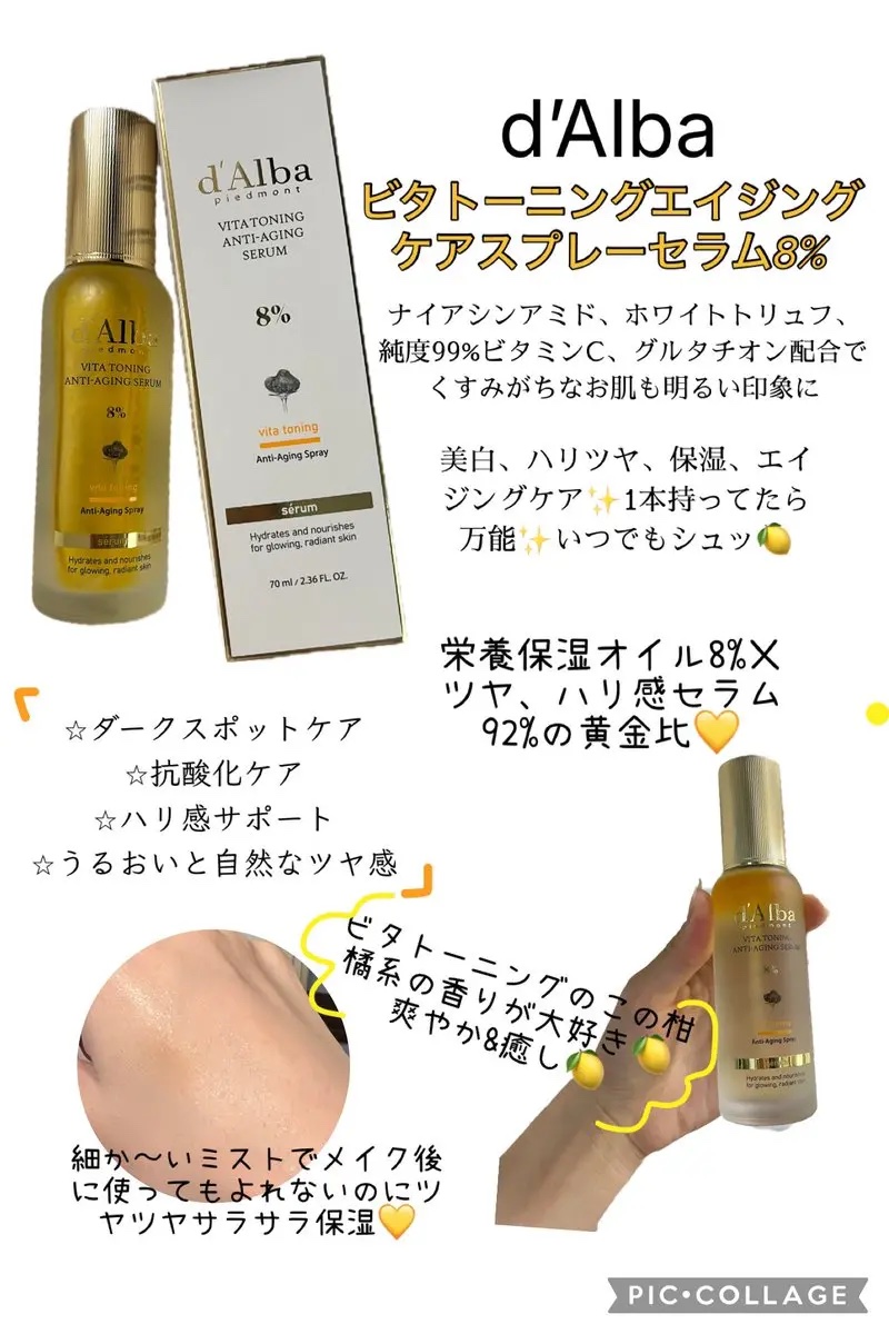 🧡ダルバ ビタトーニングアンチエイジングスプレーセラム8%🧡前回のメガ割でセットで購入しました!!!オイルと化粧水の2層ミストで保湿力あると思います✨ミストも細かい!!!なんかいい香りします!!お風呂上がり、とりあえずめっちゃ振りかけてます笑...