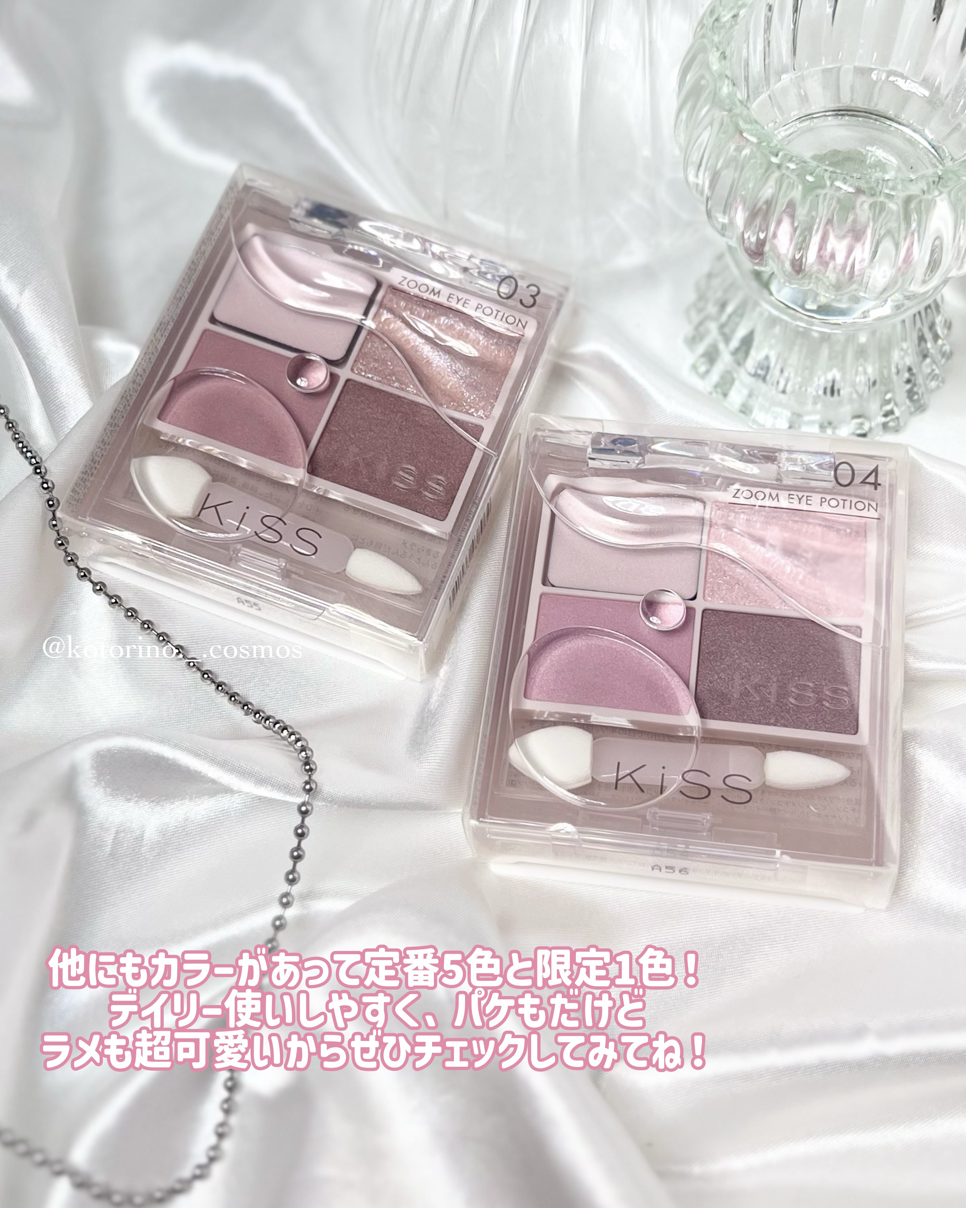 好きすぎて2色目購入KiSSズームアイポーション04ナデシコティアー¥1,760(税込)か粘膜拡張カラーでうるちゅる目もとに理想の顔に整えるアイカラーパレット水面を感じるクリアパケ。とっても涼しげ。ダブルエンドのチップ付き。結構柔らかめの粉質...