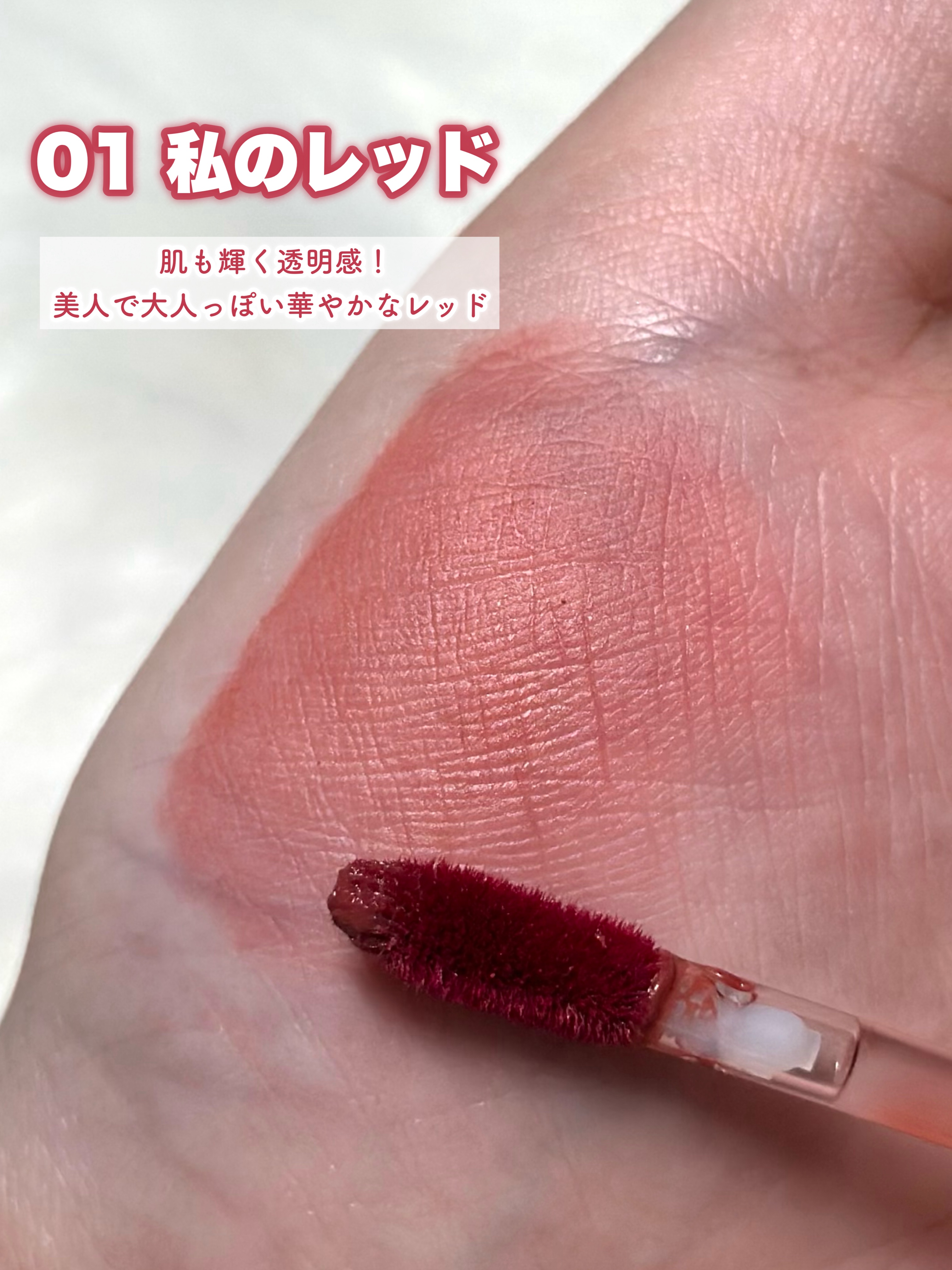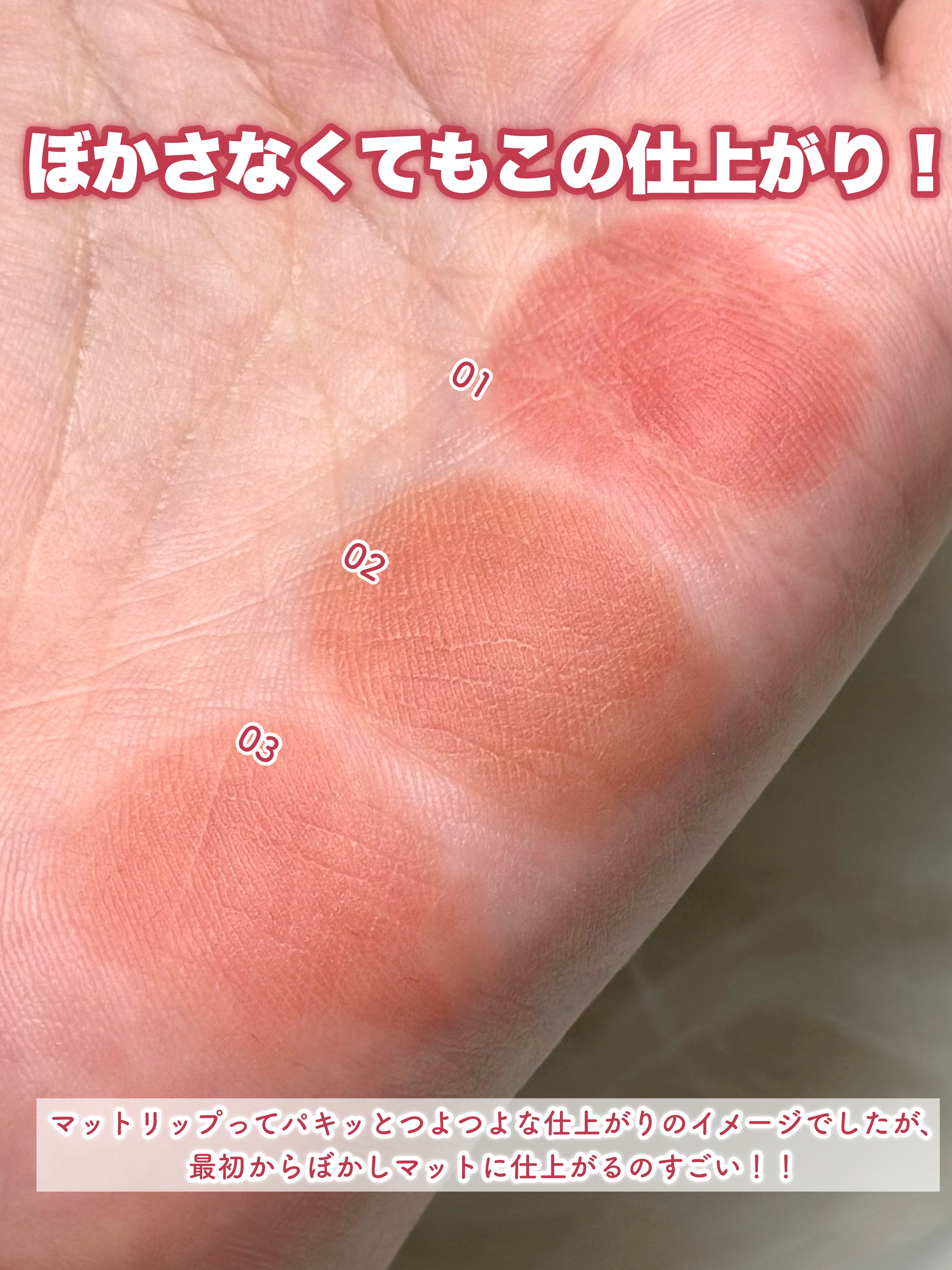 - \とりあえず塗るだけ/ パッと血色感 × ふんわり長持ち STAY WITH ME 私の唇になりすます かわいいぼかしマット唇が簡単に♪ 厚みのあるシャーベット質感が唇にやさしい使い心地で密着し、「ぼかしマット」に変化。 つけているのを忘れるくらいふんわり軽い薄膜ブラーマットだから自然に盛れる❤ ●一度乾けば色持ちも持続! 「飲み会リップ」の仕込みにおすすめ♡ ●唇の上にしっとり厚みのあるベルベット膜が形成され、色移りしにくい処方♡ ●3種類のスキンケア成分配合で乾燥しずらいのが特徴♡ ホホバ種子油・オリーブ果実油・アボカド油(全て保湿成分) 01:私のレッド \肌も輝く透明感*/美人で大人っぽい華やかなレッド 02:私のローズ \顔立ちスタイリッシュ/トーンを抑えた上品なローズ 03:私のピーチ \自然体の可愛さ/計算尽くのあどけなさで視線を奪う大人のピーチ *メイクアップ効果