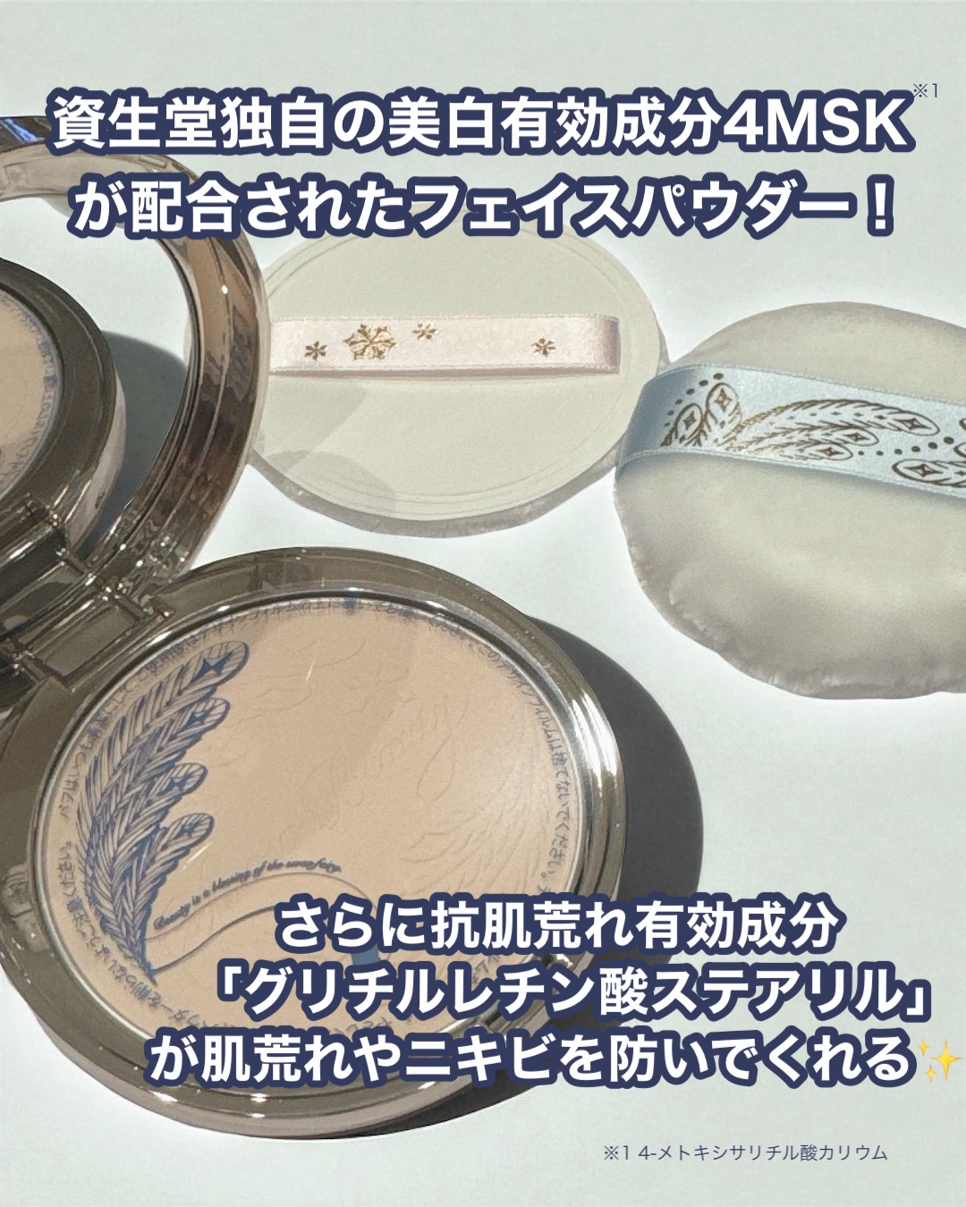 - (医薬部外品) 【数量限定品】 美白ケア&透明感アップ。薬用美白スキンケアパウダー。 朝はメイクの仕上げや日中は化粧直し、夜はスキンケアの最後の素肌ケアに。 美白有効成分「4MSK」(4-メトキシサリチル酸カリウム塩)が肌に浸透。 穏やかにやさしく香る、フローラルアロマの香り。 どれが出るかはお楽しみ。3種類のデザインフィルム付き。 ※美白とは、メラニンの生成を抑え、シミ・そばかすを防ぐこと。 [セット内容] ・スノービューティーブライトニングスキンケアパウダー(医薬部外品) フェイスパウダー25g (販売名 スノービューティーブライトニングスキンケアパウダーA) ・専用アミュレットポーチ ・スムースフィットパフ ・なめらかソフトパフ ◆2025年6月21日(土)よりドラッグストア・GMS・化粧品専門店などの店頭や「資生堂オンラインストア」などのECサイトで予約を開始します。