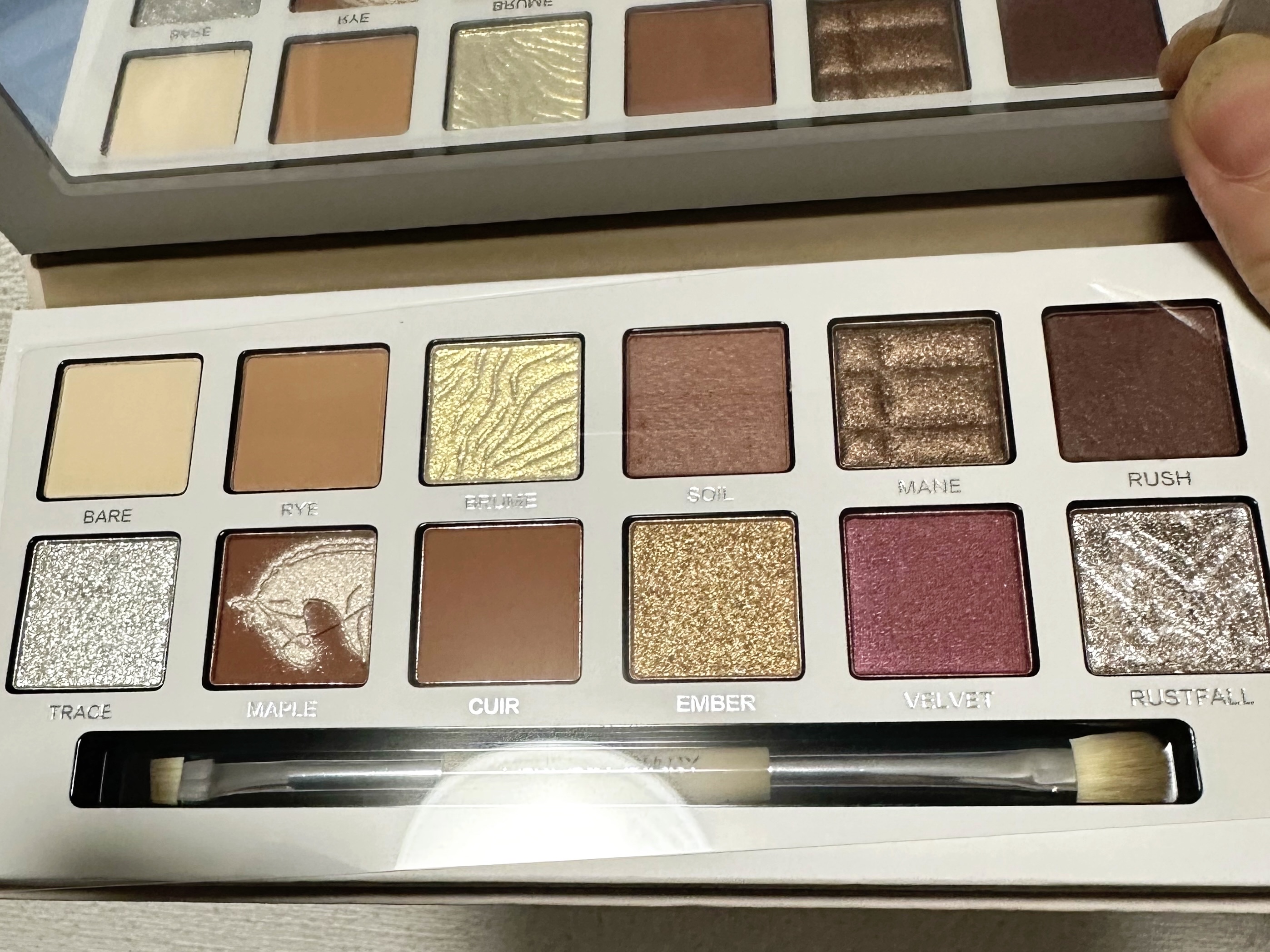 マット部がブラウン系で黄みは当然ながらあるけれども、そこまで黄色浮きしなそうな色みなのが良さげ。 こういうの、黄みを剥ると何故か紫ピンクかグレーにしてく傾向あるけど、グレー系が欲しいわけじゃなくって、中間のブラウンが欲しいんだよね!紫みブラウンはそれはそれで大好物だけどね! 買ってみてなかなか良かったプロ アイパレット ミニ01である。