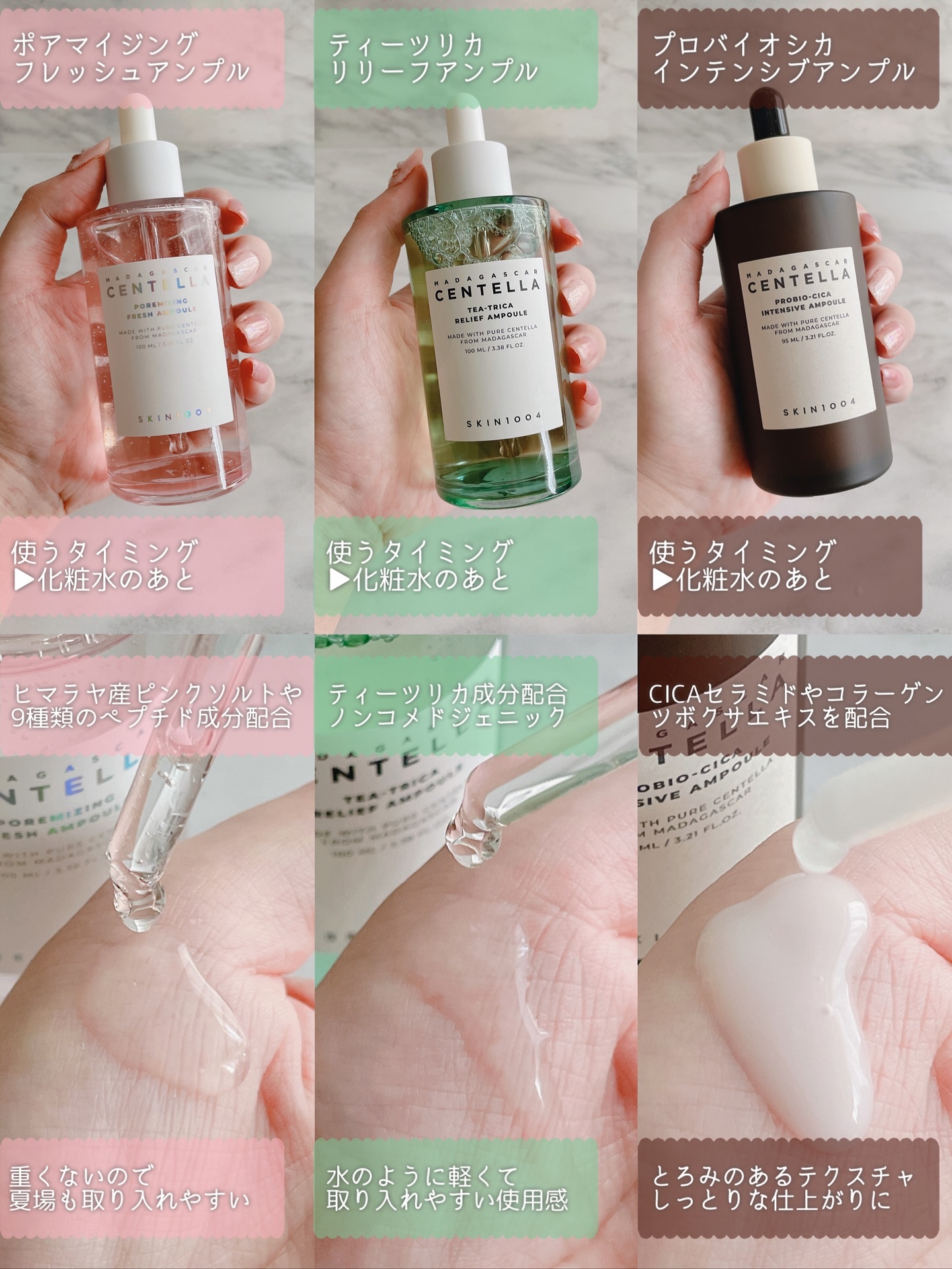#PRSKIN1004様よりご提供いただきました肌悩み別に使用できる6種のアンプル🌿パケも可愛く、自分に合ったアンプルが見つかる👀✨💛赤み・敏感肌→センテラアンプル🩵乾燥・カサつき→ヒアルーシカファーストアンプル🤍シミ・くすみ→トーンブラ...