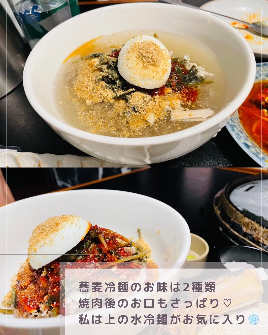 \一度は絶対食べたい!💋/ 【高山熟成焼肉とトビコ韓牛ユッケ🐃🐷】 ✔︎︎ 焼肉の激戦区マポの大人気店 ✔︎ 高山育ちの上質豚を熟成肉で🐷 ✔︎ トビコ乗せ韓牛ユッケ🐃❤️ ✔︎ 席で仕上げ焼き→カット済で即食べられる◎ .°—————————————————-°. 焼肉の名店ひしめくオフィス街・マポで グルメなOLたちをうならせる熟成焼肉店✨ 平日19:30、予約なしでも入れたよ🫶🏻 (人気なので行くならお早めに!) ———————— オーダーしたのは ①トビコのせ韓牛ユッケ🐃 ②豚ロース(お店のシグネチャー)🐷 ③蕎麦冷麺(水冷麺) ④蕎麦冷麺(ビビン冷麺) ———————— まずパンチャン(お通し)が豊富 薬味もたっぷりでチゲまでサービス♡ テンション爆上がり…🤤 ①ユッケは… トビコのプチプチ感と 真っ赤なユッケのコントラストが最高❤️ 卵黄ととろ〜り混ぜて味わって✨ ②豚ロースは 厨房で高温焼き→仕上げは席で!🔥 カットまでしてくれるから 私たちは食べるだけ♡ お肉が本当に柔らかくて 「牛…?これ豚!?」ってなる驚き😳 2人で4人前ぺろっと完食🐷💕 ③④冷麺は 実は今まであまり得意じゃなかったけど ここので好きになった!♡🥹 水冷麺はさっぱり爽やか❄️ ビビン冷麺はピリ辛アクセント🇰🇷 私は水冷麺派🫶🏻 ———————— ユッケも焼肉も冷麺も楽しめて 大・満・足ーーー!💖 チャルモゴスムニダ〜🙏🏻✨ ぜひ足を運んでみてね🥰 *.°—————————————————-*.° 『高度食(コドシッ)マポ店』 (고도식 마포점) 📍 ソウル特別市 麻浦区 龍江洞 50-16 🚇 5号線・マポ駅   1番出口から273m ⏰ 月〜木 16:00-22:40   金〜日 12:00-22:40(15-16時は準備) ( Naverマップより🇰🇷 最新の情報はご確認ください ) *.°—————————————————-*.° 〜コリアーナまみニョン〜 韓国歴17年/美容オタクママ💋 渡韓のたび進化する旅行ハック発信中✈️ Qoo10中毒/渡韓オタク/楽天ROOM愛用中 → プロフィールのリンクから🔗🌸 .°—————————————————-°. * * #韓国マニア #韓国情報発信 #韓国旅行 #韓国ひとり旅 #韓国女子旅 #ソウル観光 #韓国グルメ #ソウルグルメ #韓国焼肉 #韓牛 #ユッケ #サムギョプサル #高度食 #고도식 #マポグルメ #麻浦グルメ #韓国に恋するアラフォー #美容オタクの日常 #韓国好きさんと繋がりたい