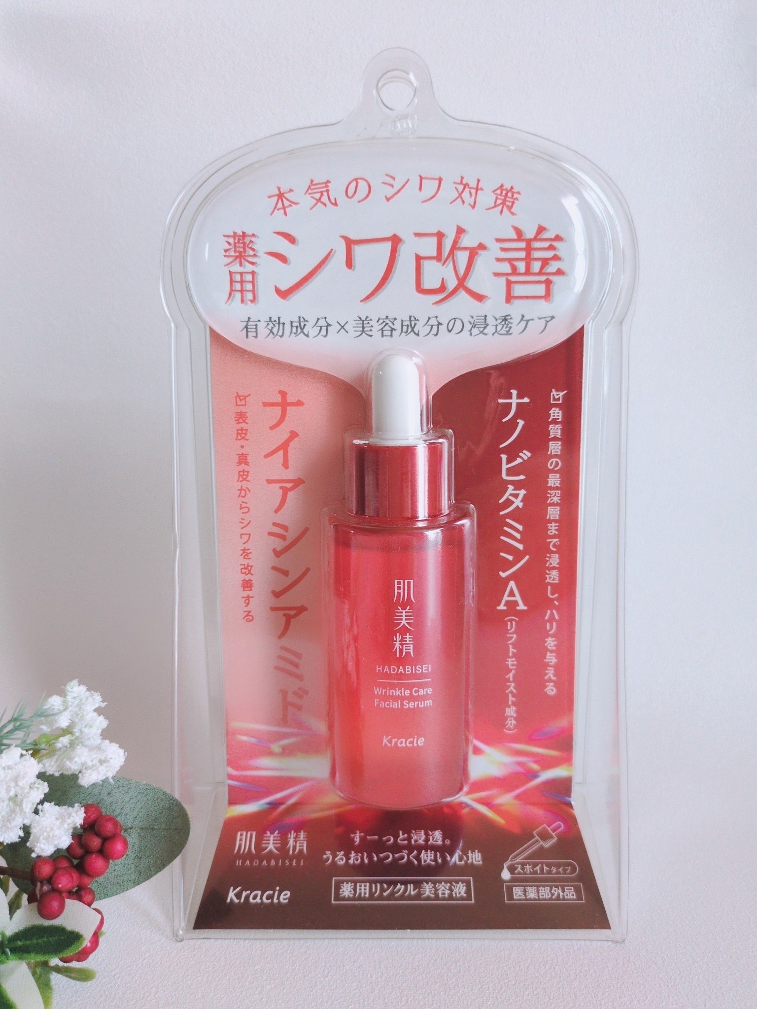 - 【医薬部外品】 オイルタッチでうるおい続くのにべたつかず、朝も夜も使いやすい薬用シワ改善美容液 うるおいを閉じ込め、シワの原因からアプローチし、弾むようなハリと輝きに満ちた輝光肌へ導きます。 ●リフトモイスト成分「ナノビタミンA*6」&ハリ・弾力成分「スプリングミント*7」配合 Wの美容成分配合で、うるおいケアとバランスケアを行い、ふっくらもっちり肌へ導きます。 (ご使用方法) 化粧水などでお肌を整えた後、適量を手に取り、顔全体にやさしくなじませてください。朝晩お使いいただけます。 *6:ビタミンA油・POE硬化ヒマシ油・ラウリン酸POE(20)ソルビタン *7:セイヨウハッカエキス ※リフトモイスト:保湿効果で肌がふっくらすること ※透明感:うるおいによる ※浸透:角質層まで 【シリーズ共通商品特長】 ●Wの有効成分配合の薬用シリーズ ・美白有効成分「高純度ビタミンC」&消炎成分「トラネキサム酸」配合(美白化粧水・美白美容液) Wの有効成分配合で、シミができるプロセスに効果的にアプローチし、透明感のある肌へ導きます。 ・シワ改善×美白有効成分「ナイアシンアミド」&消炎成分「パンテノール」配合(リンクル美容液) 表皮・真皮からシワを改善し、メラニンの生成を抑え、シミ・そばかす、肌あれを防ぎます。 ●クラシエ独自「浸透アクアブースト処方」ですーっと素早く浸透 「浸透促進成分CHD*2」配合で、有効成分や美容成分を角層の最深層まで届けます。 ●無香料、無着色、アルコール*3フリー ●アレルギーテスト済み、スティンギングテスト済み、パッチテスト済み (すべての方にアレルギー・皮フ刺激が生じないということではありません。) *3:エタノール