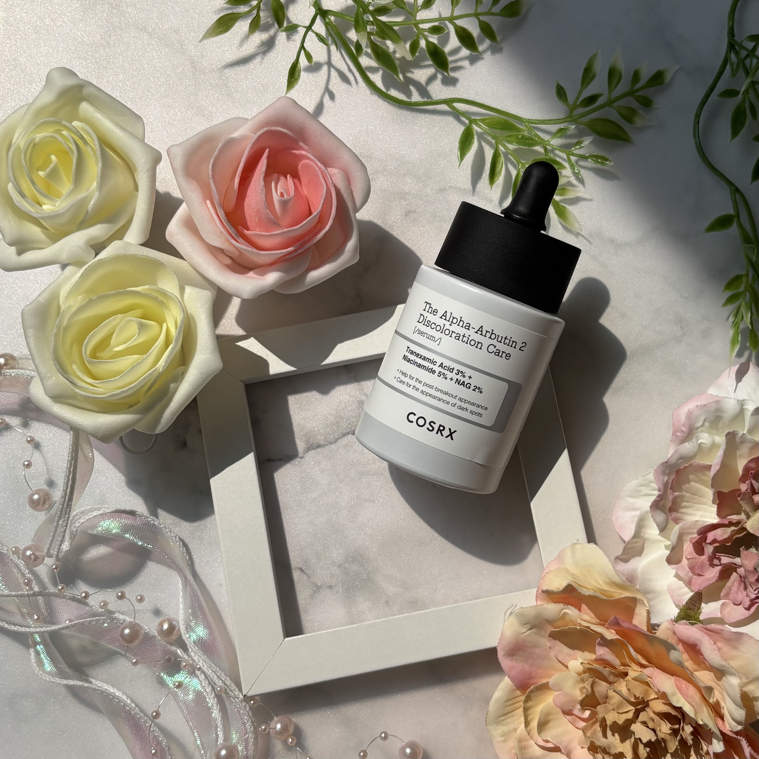 ニキビ跡や色素沈着に悩む人たちのために登場した、COSRXのダーマケアシリーズの新作🥳🌟 「アルファアルブチン」2%「ナイアシンアミド」5%、「トラネキサム酸」3%「アセチルグルコサミン」2%の4つの成分を配合し、ニキビ跡になる前の予防ならびにシミの悩み改善にアプローチします。 少し濁った薄茶色のセラムで、ほんのりとろみはあるけどサラッとみずみずしいテクスチャー🫧